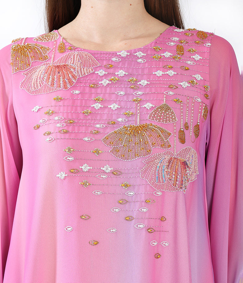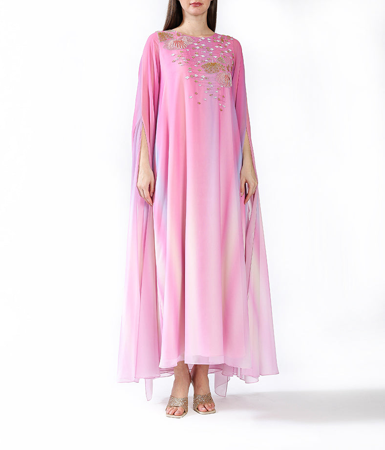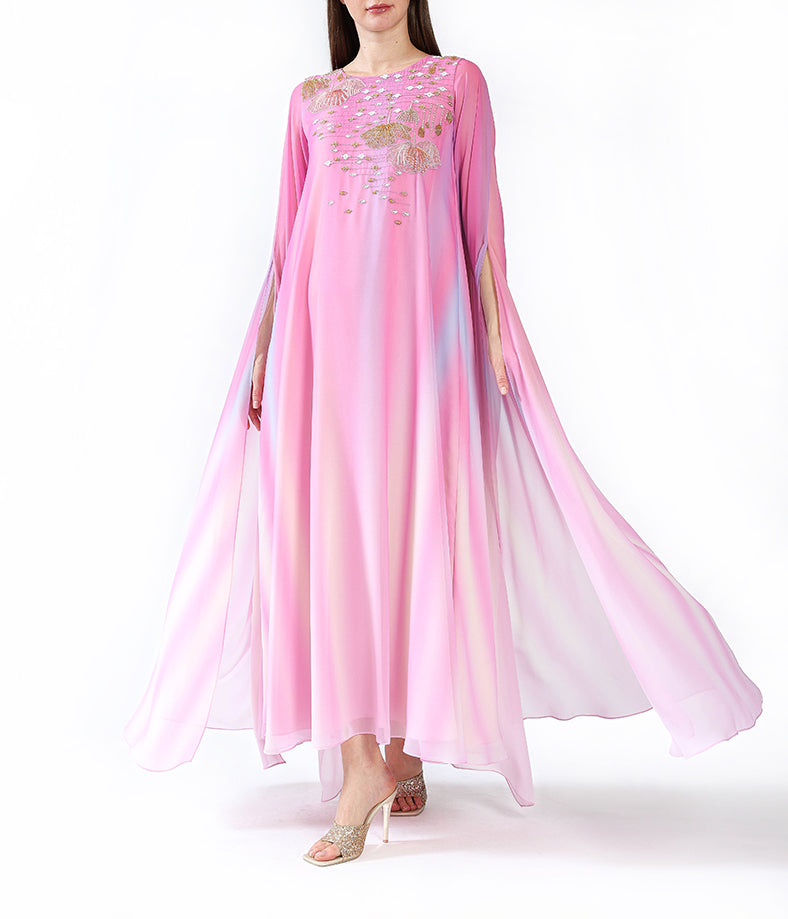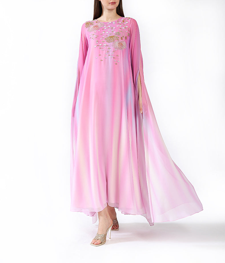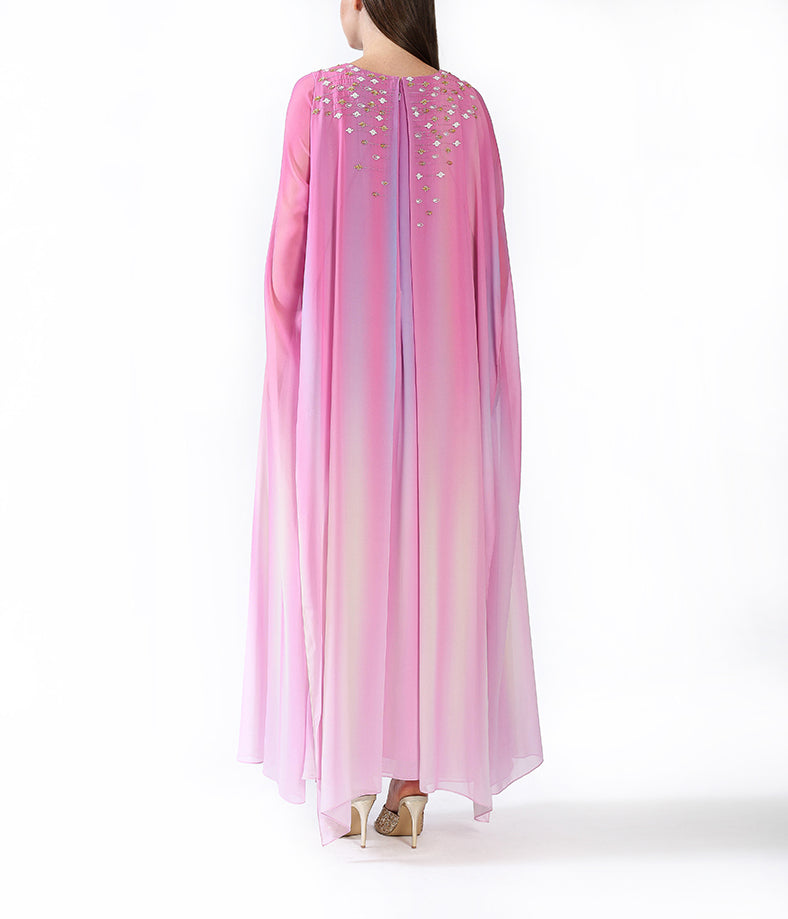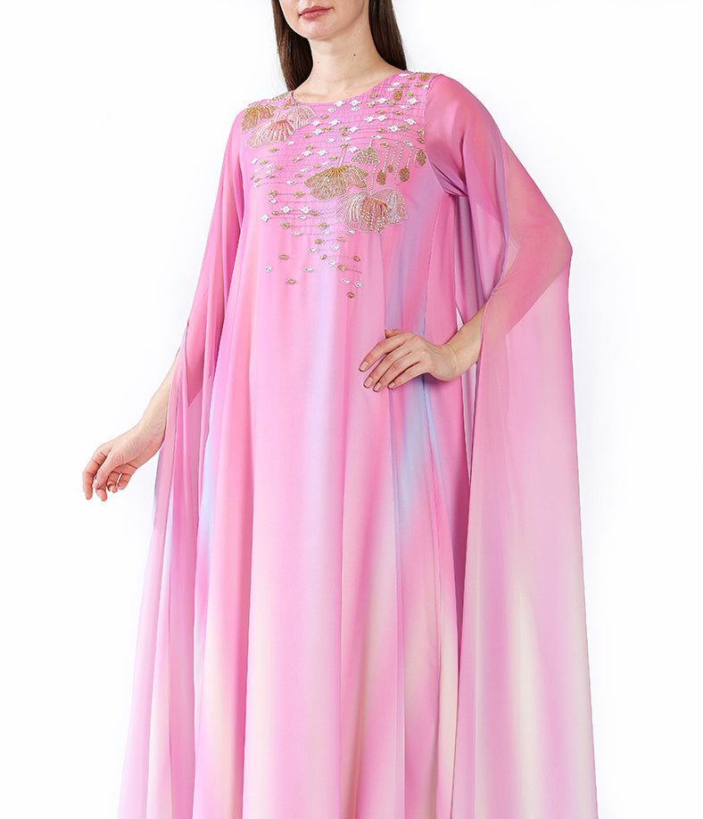 Pink gradient cape sleeves with handmade embellishment.