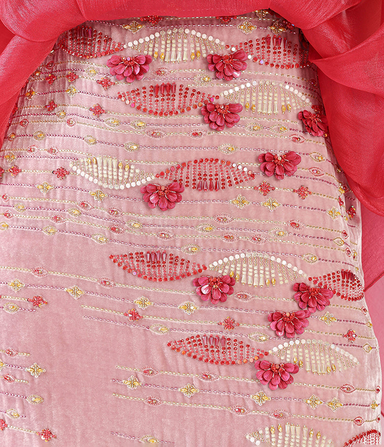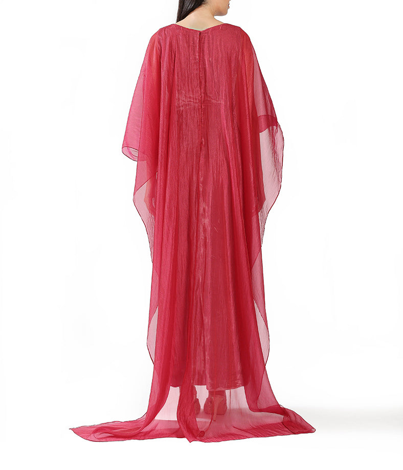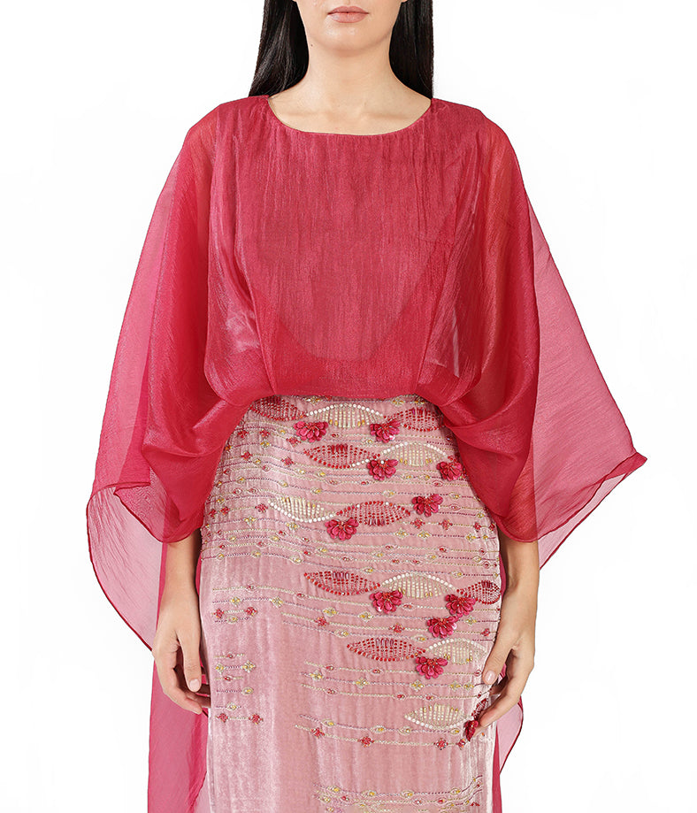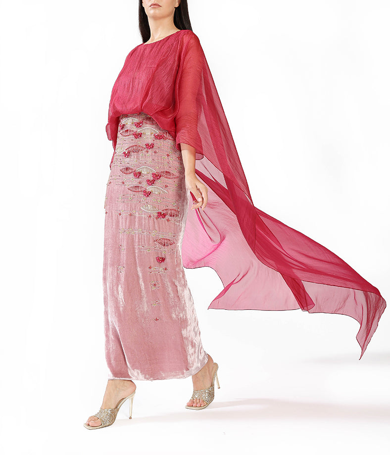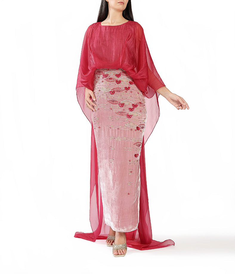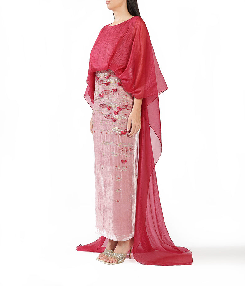 Red Velvet Pencil-Cut Chiffon Cape Dress with 3D Petal Embellishments.