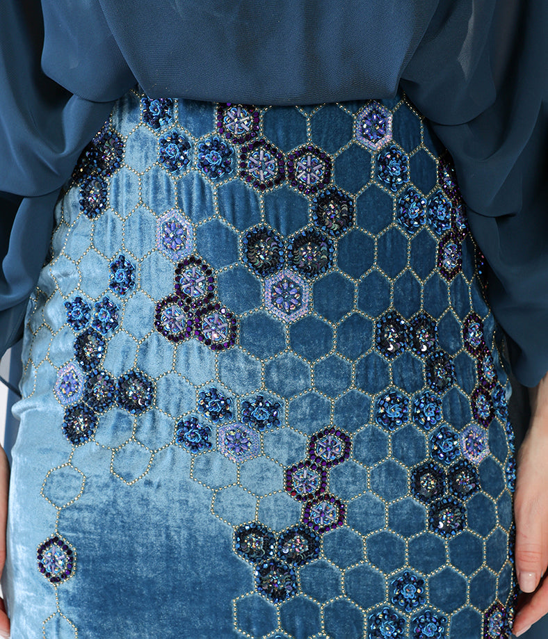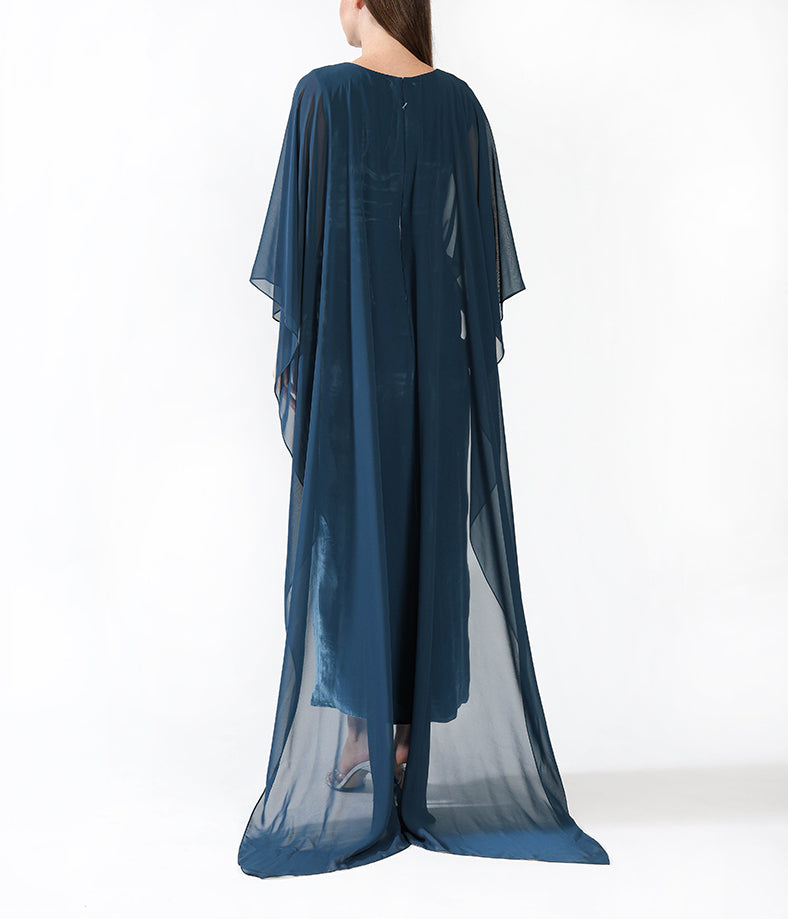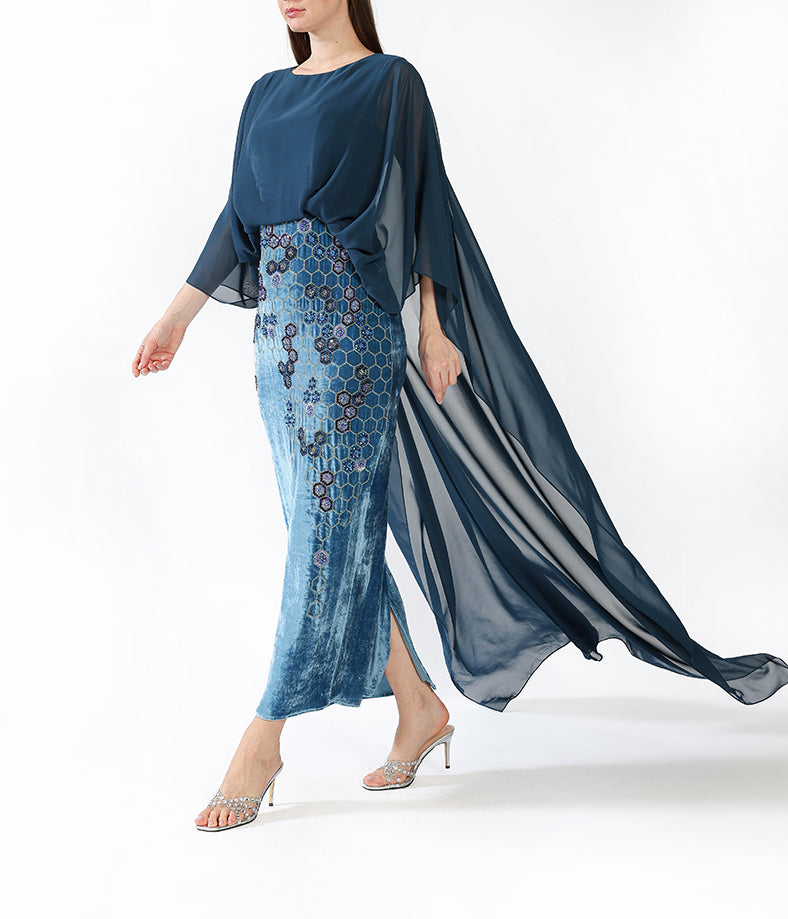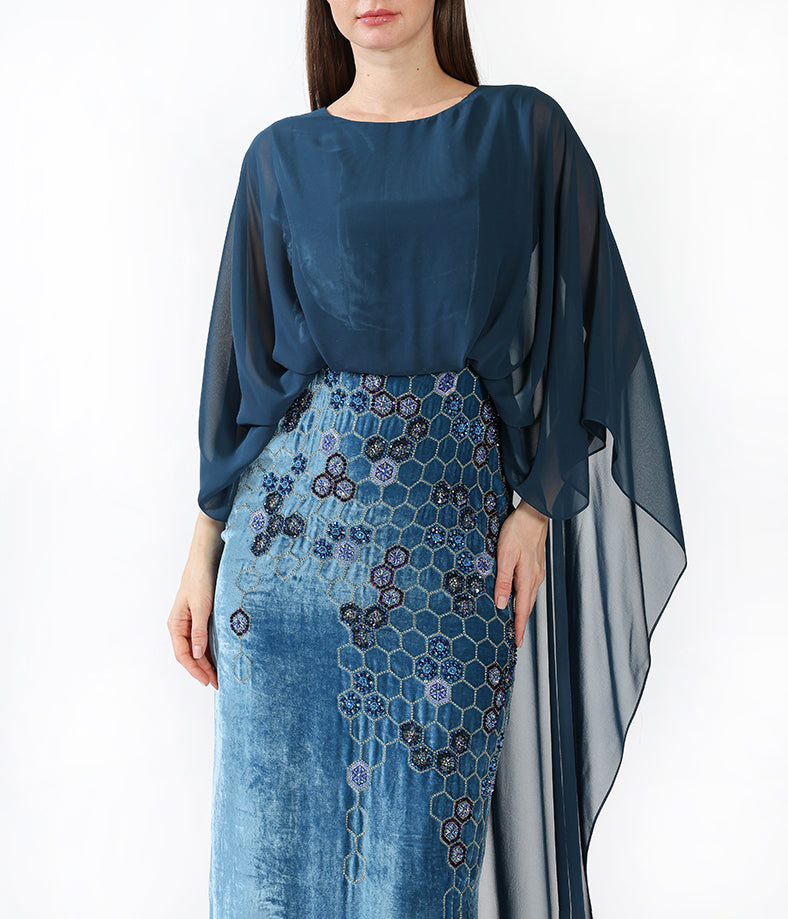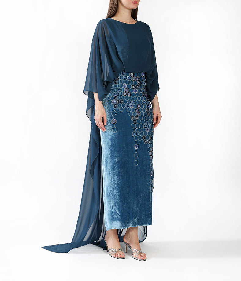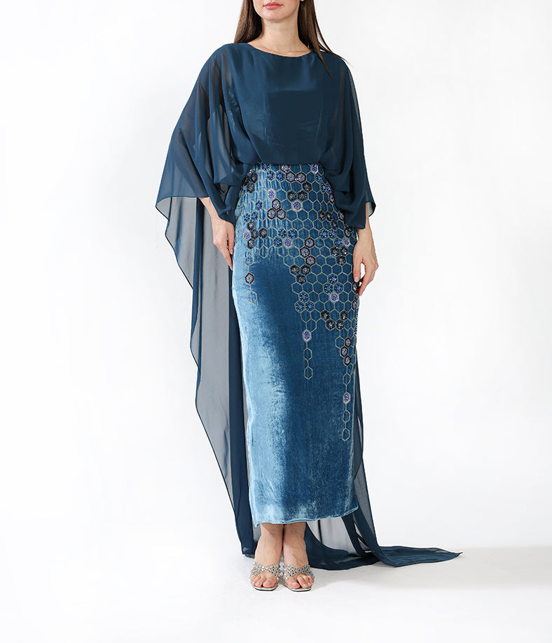 Navy Blue velvet pencil cut in chiffon cape dress with honeycomb inspired embroidery.