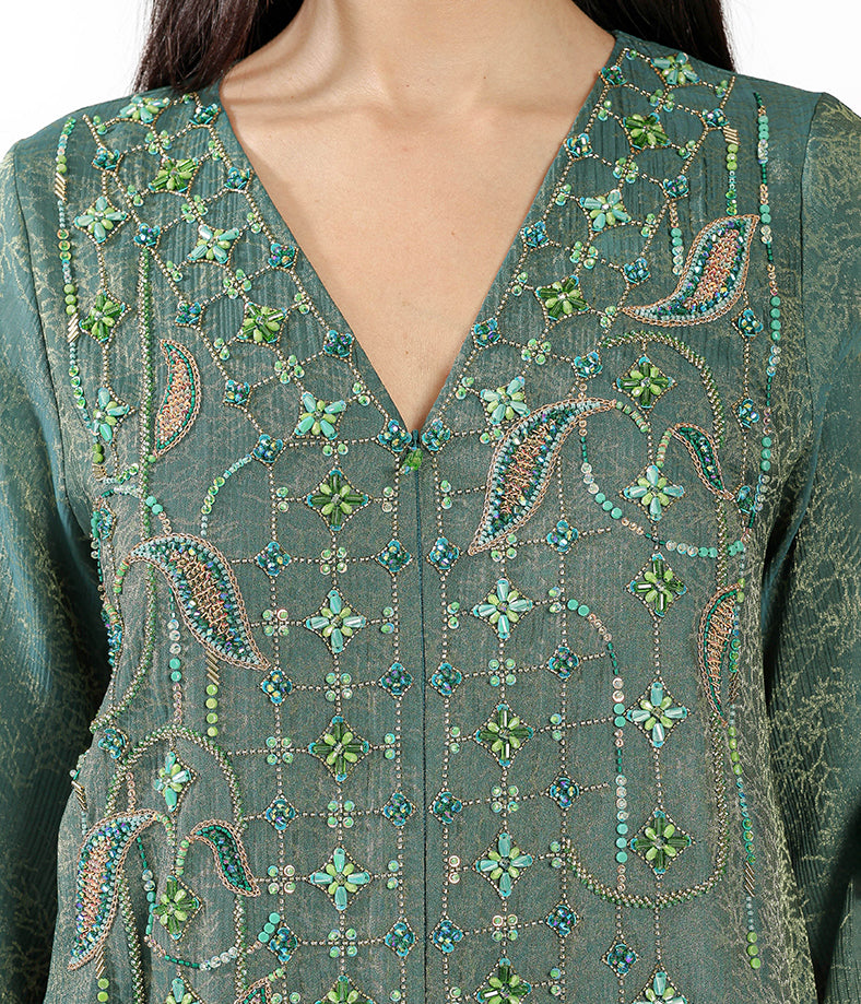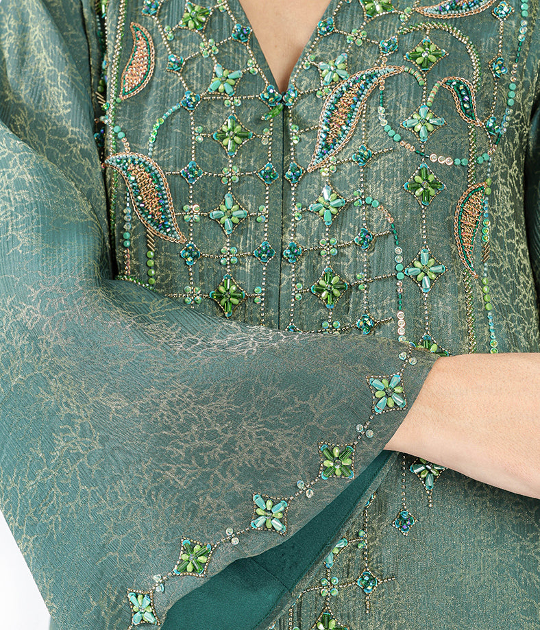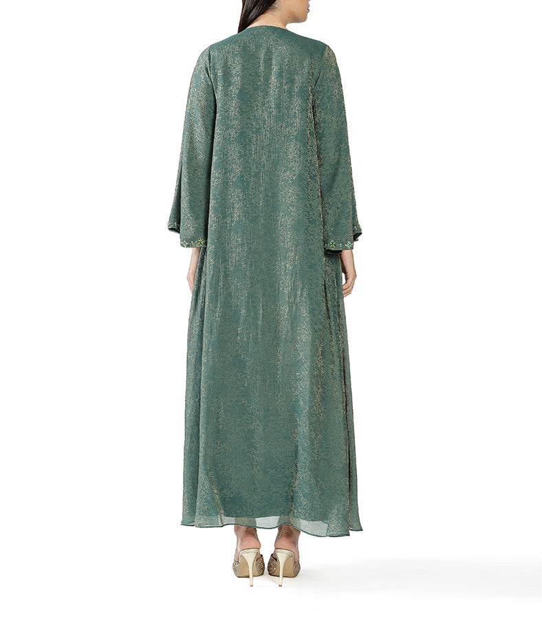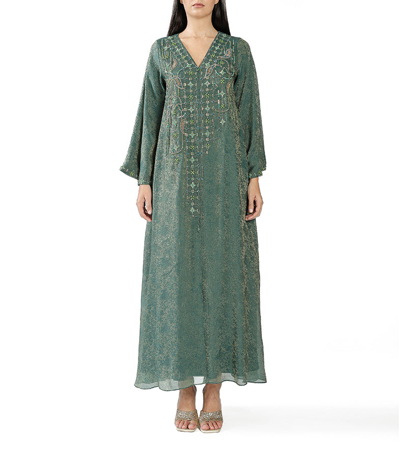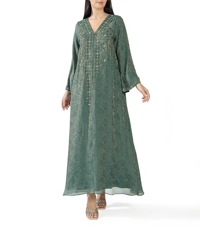 Emerald green metallic soft linen with leafy embroidery and mini flowers.
