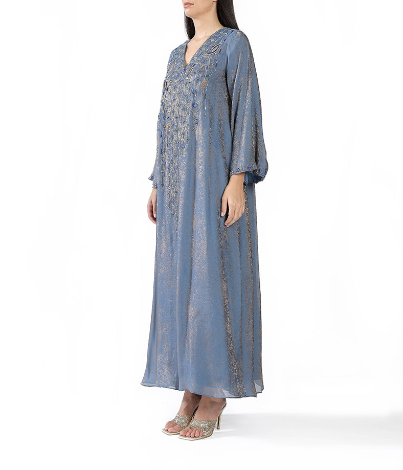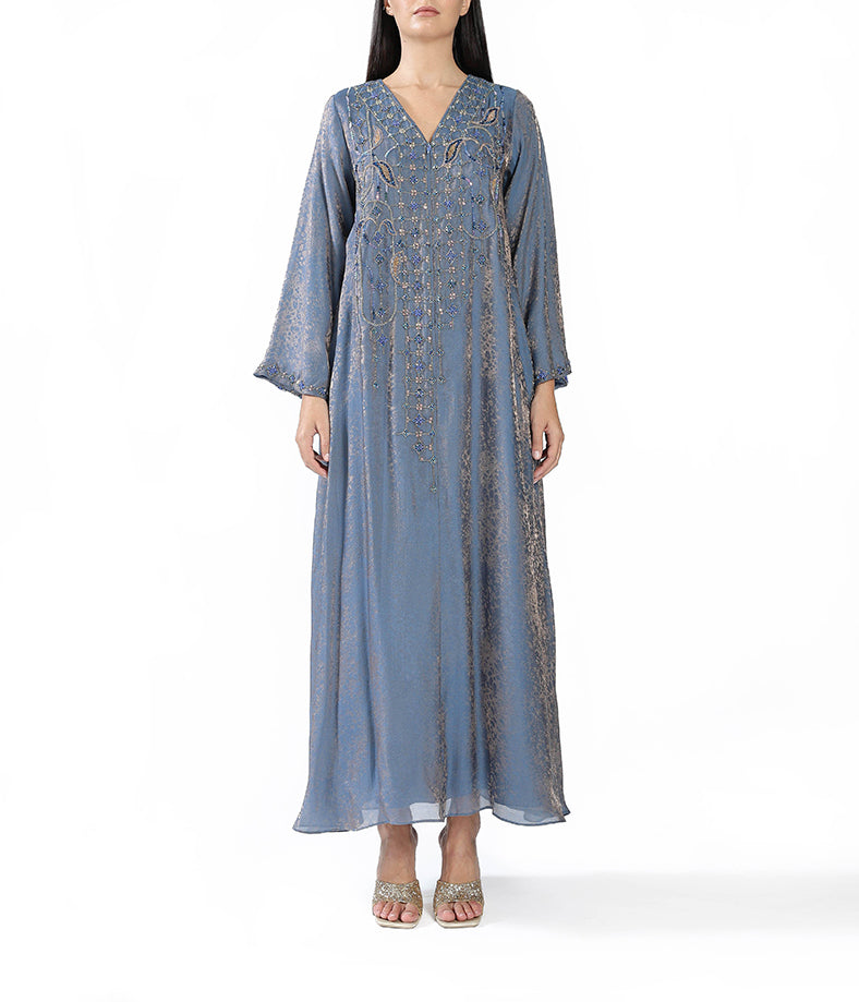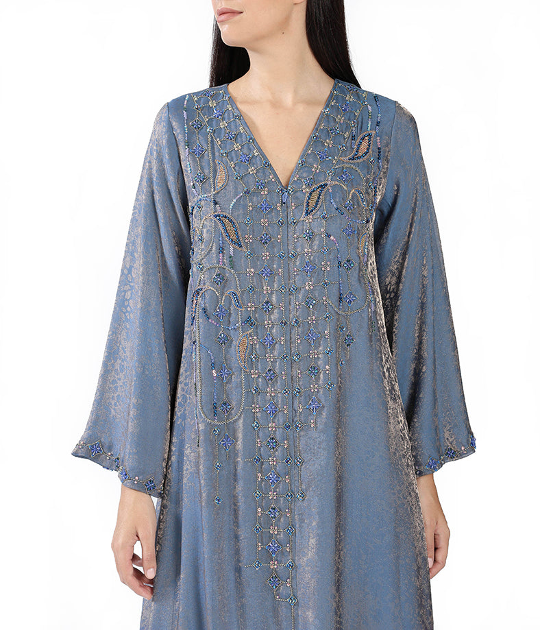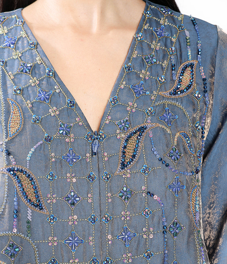 Cobalt blue metallic soft linen with leafy embroidery and mini flowers.