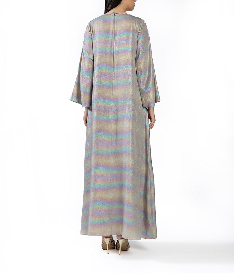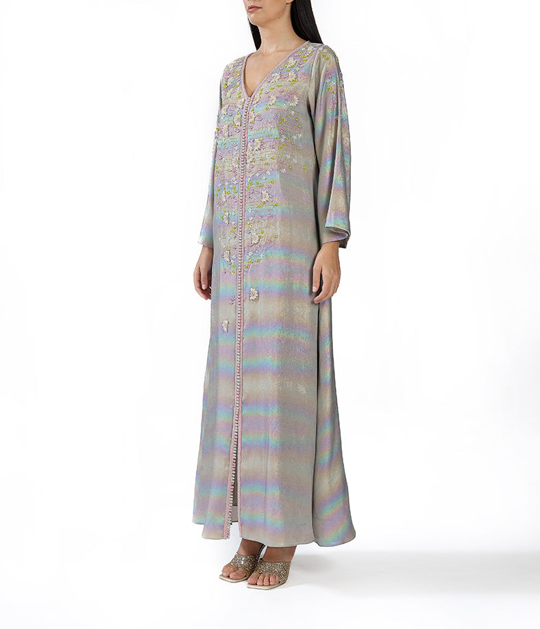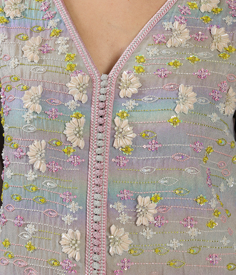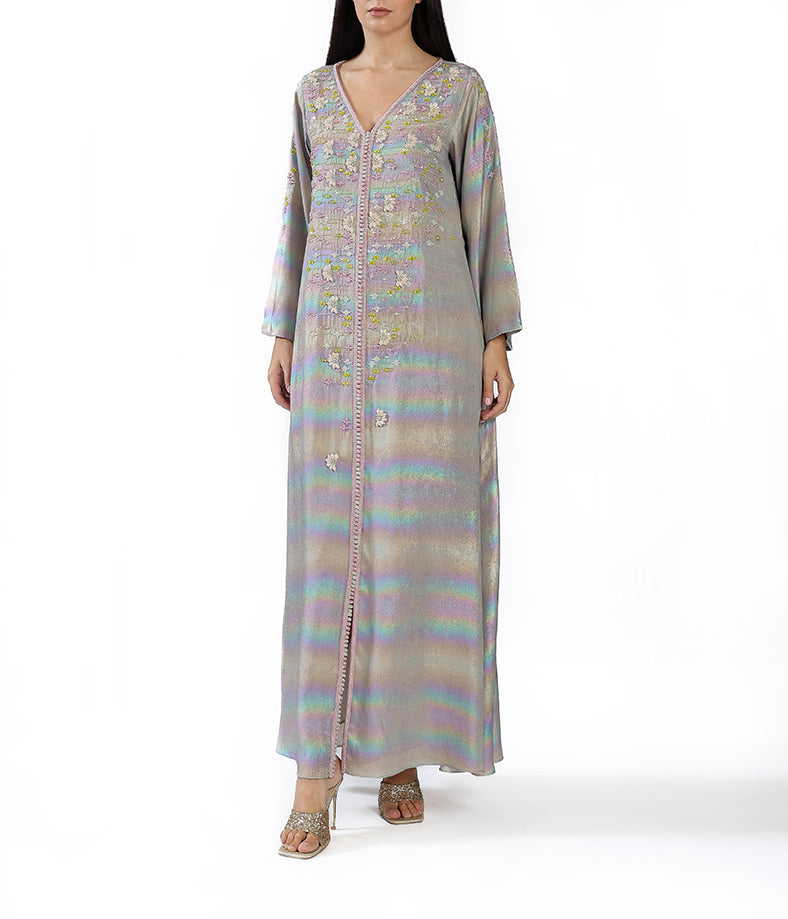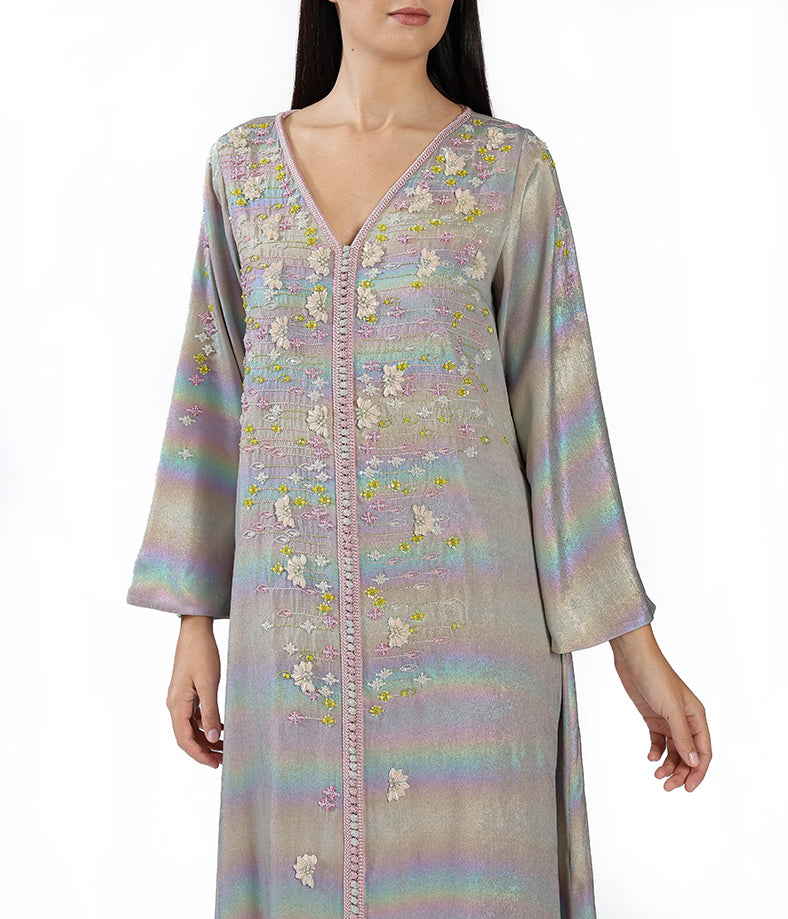 Metallic Rainbow Crepe with Moroccan Lace and 3D Multi-Flower Embroidery