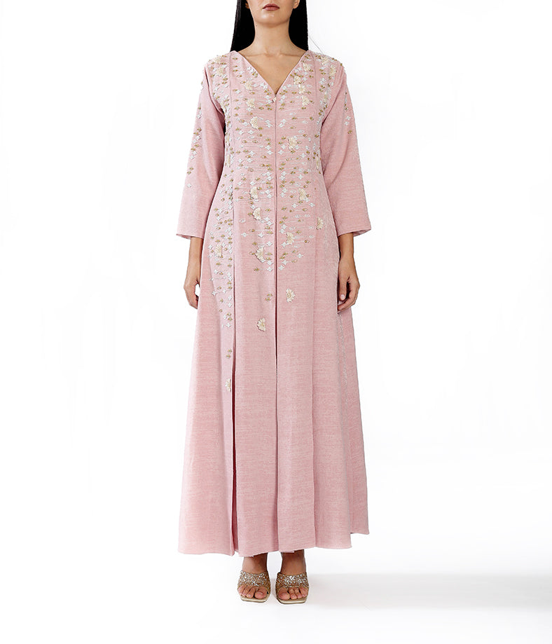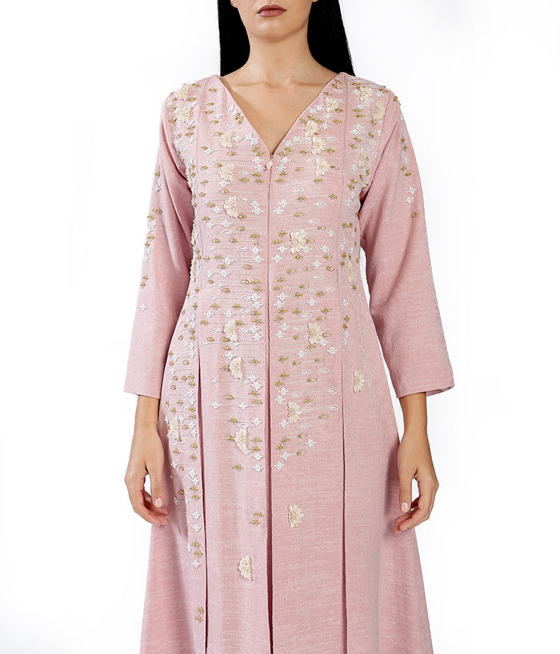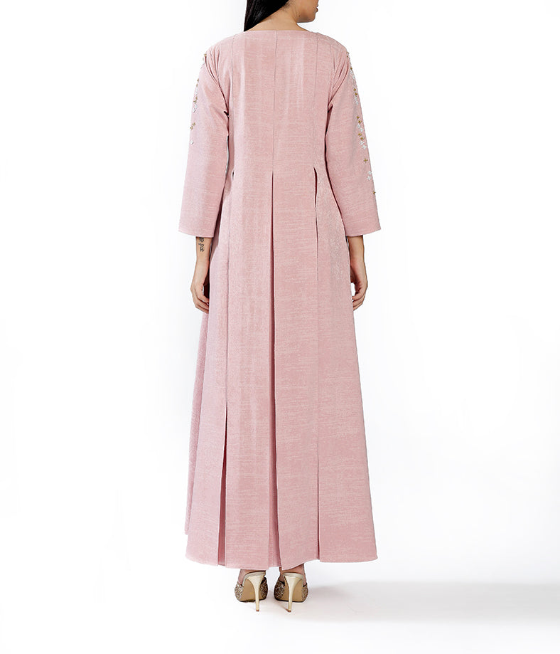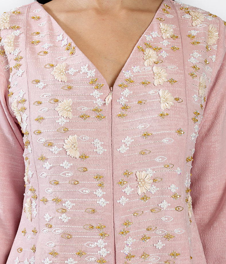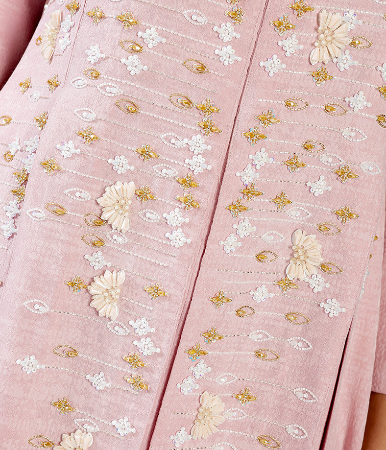 Pastel Pink Linen Featuring Custom Print, Pleated Design, and Handcrafted Embellishments.