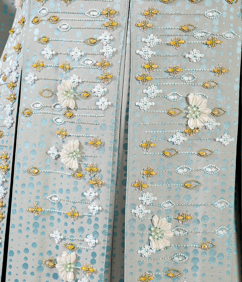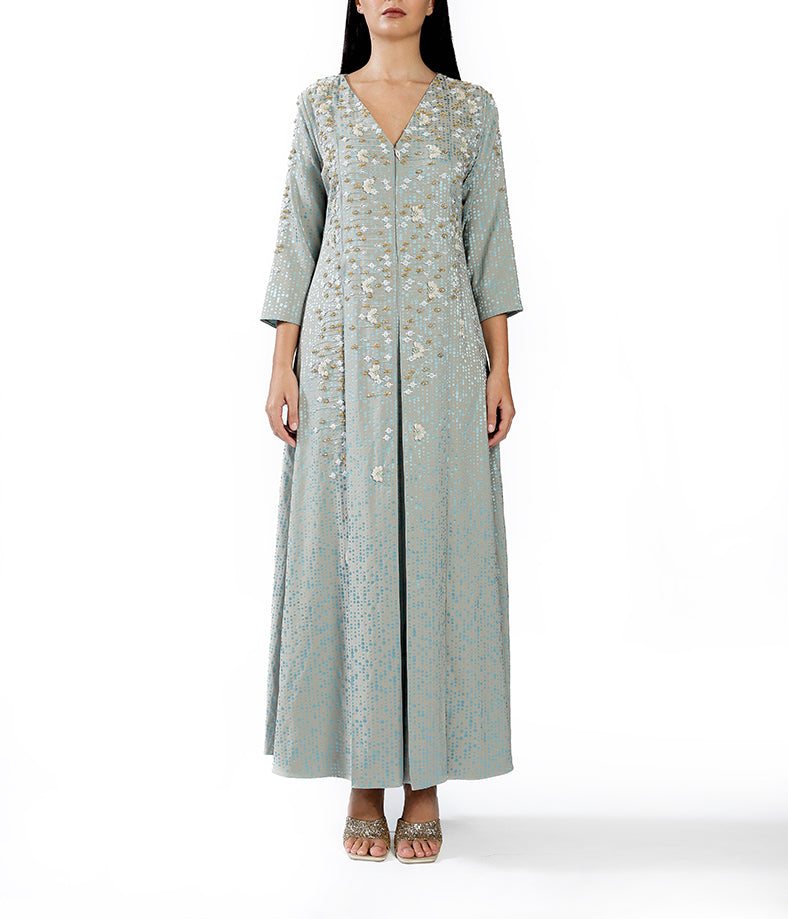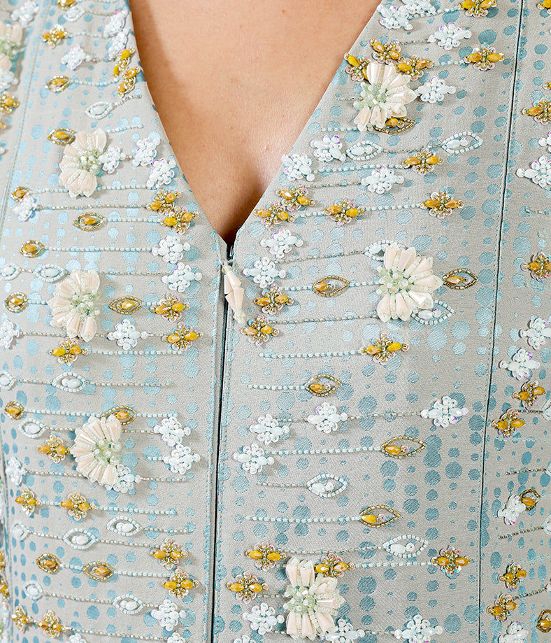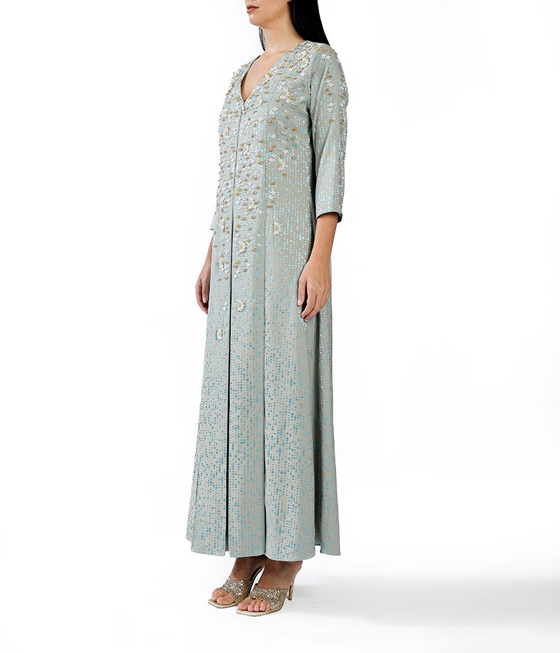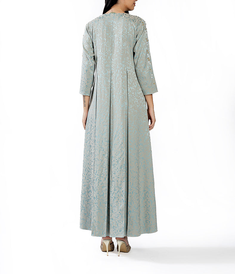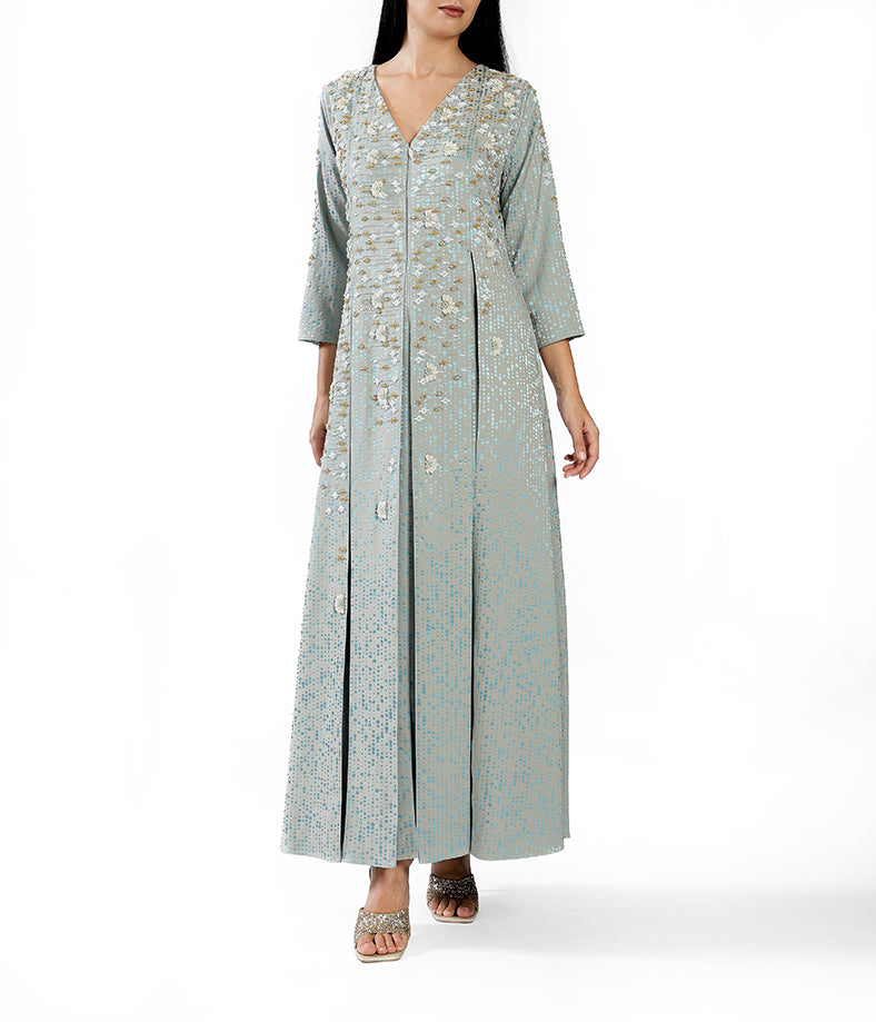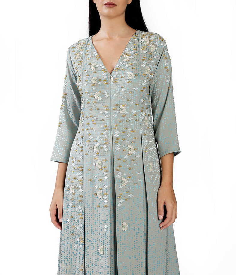 Grey Metallic Crepe Pleated Design and Handcrafted Embellishments.