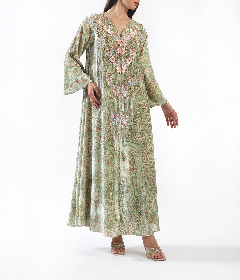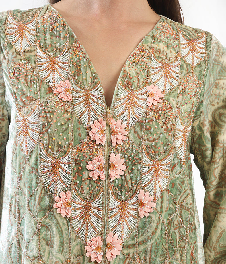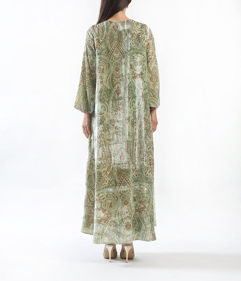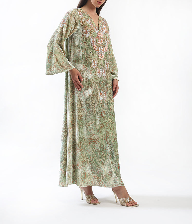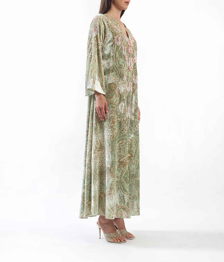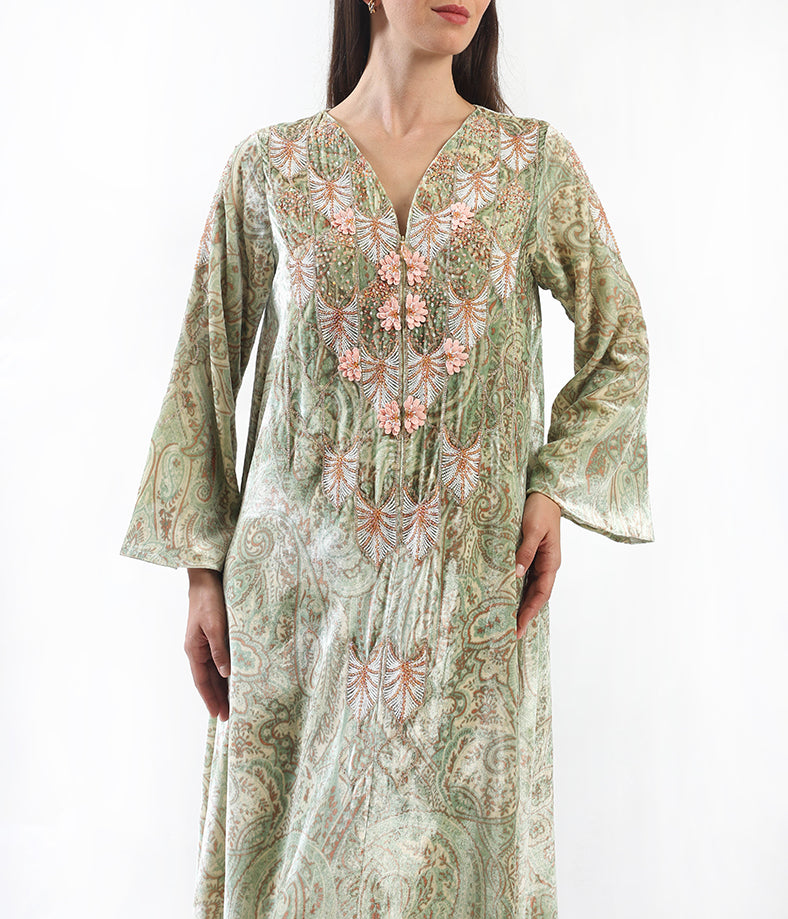 A long, elegant printed velvet kaftan in soft earthy shade with hand-made embellishments.