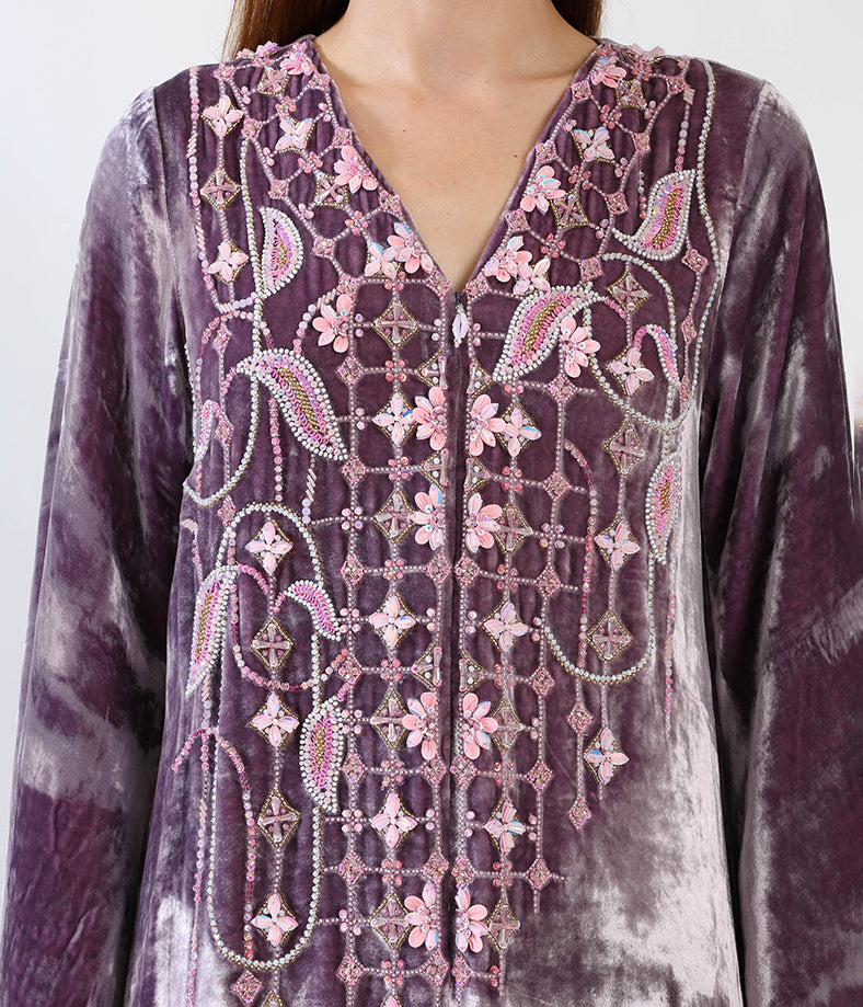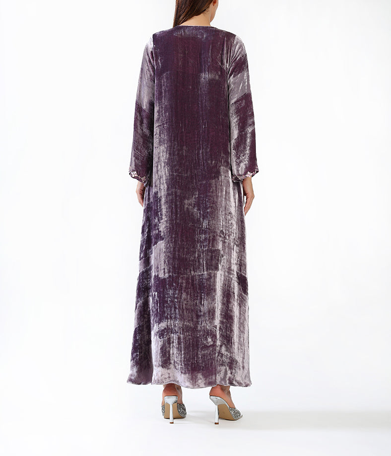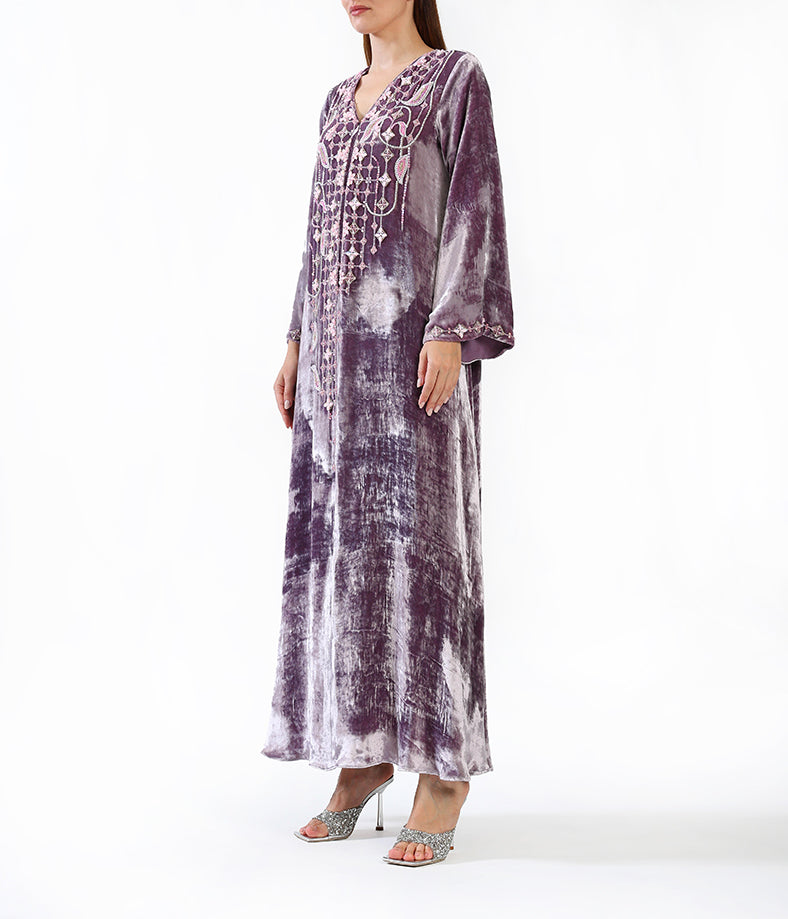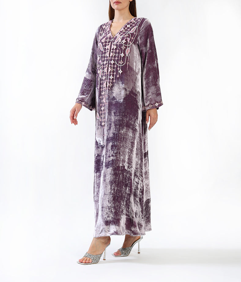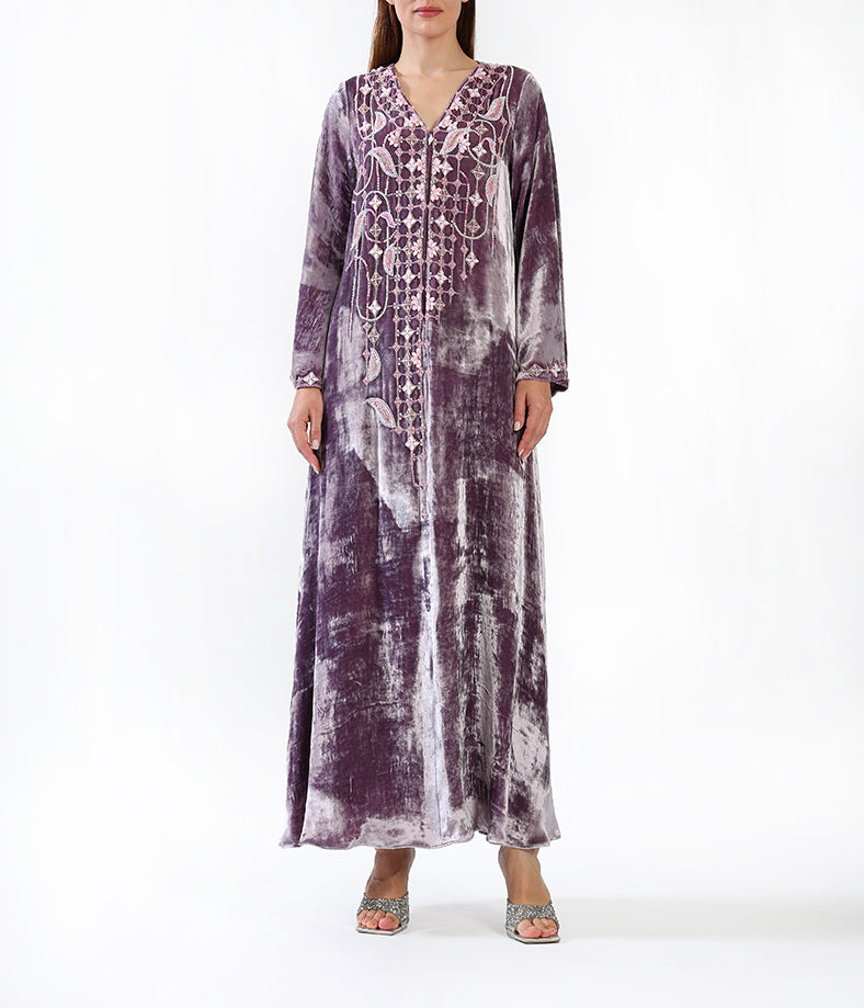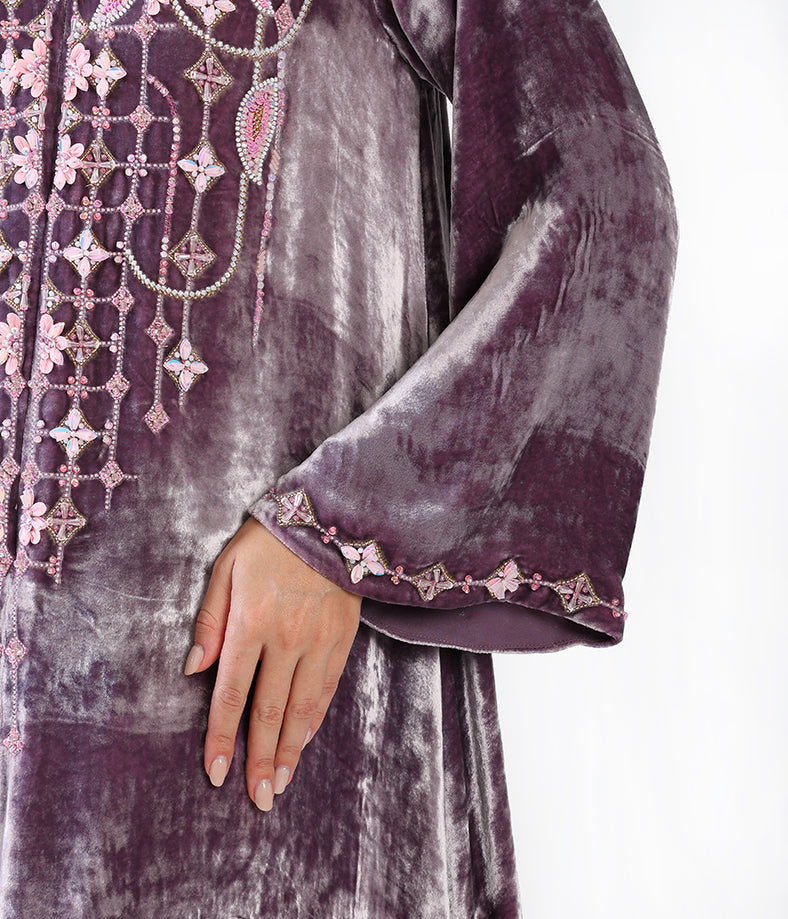 Purple velvet kaftan with hand-made garden flower embellishments.