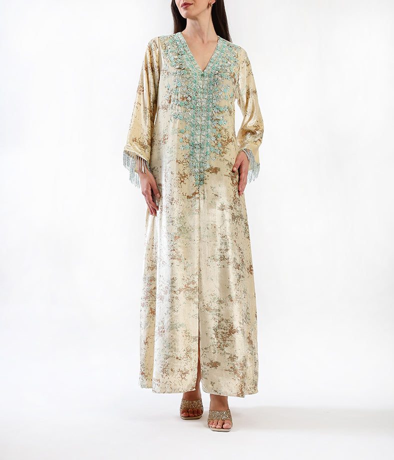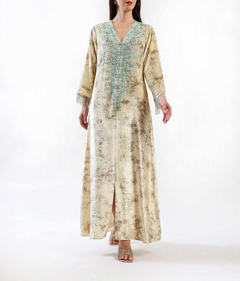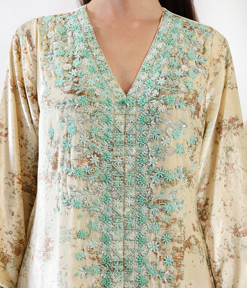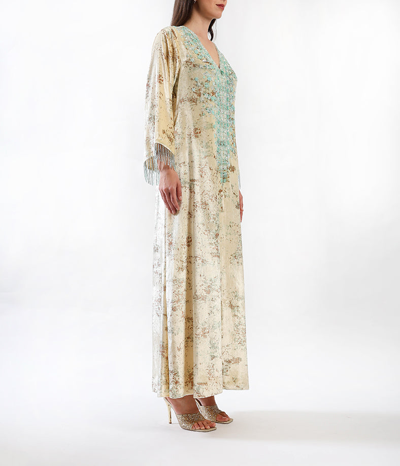 A long, elegant velvet printed kaftan in cream shade with 3d floral hand-made embellishments.