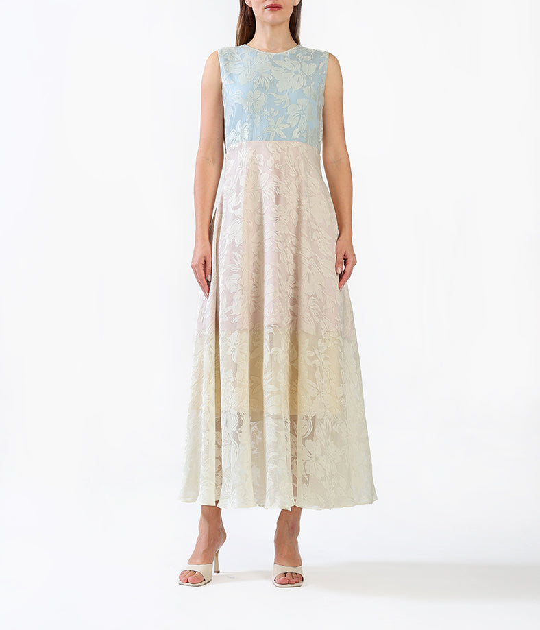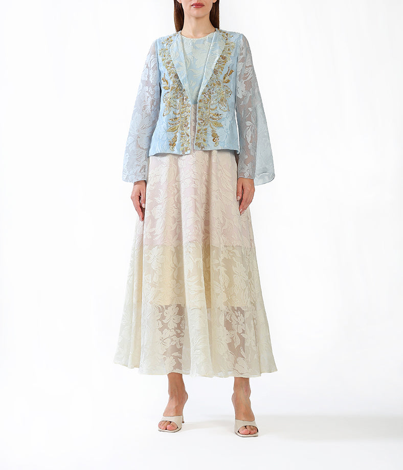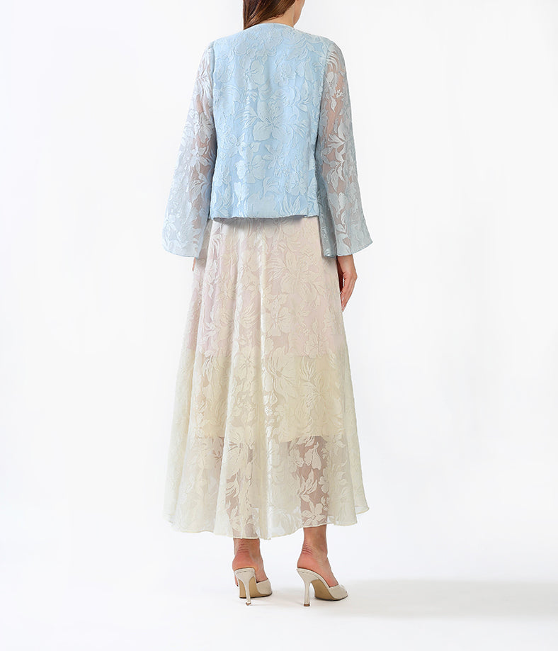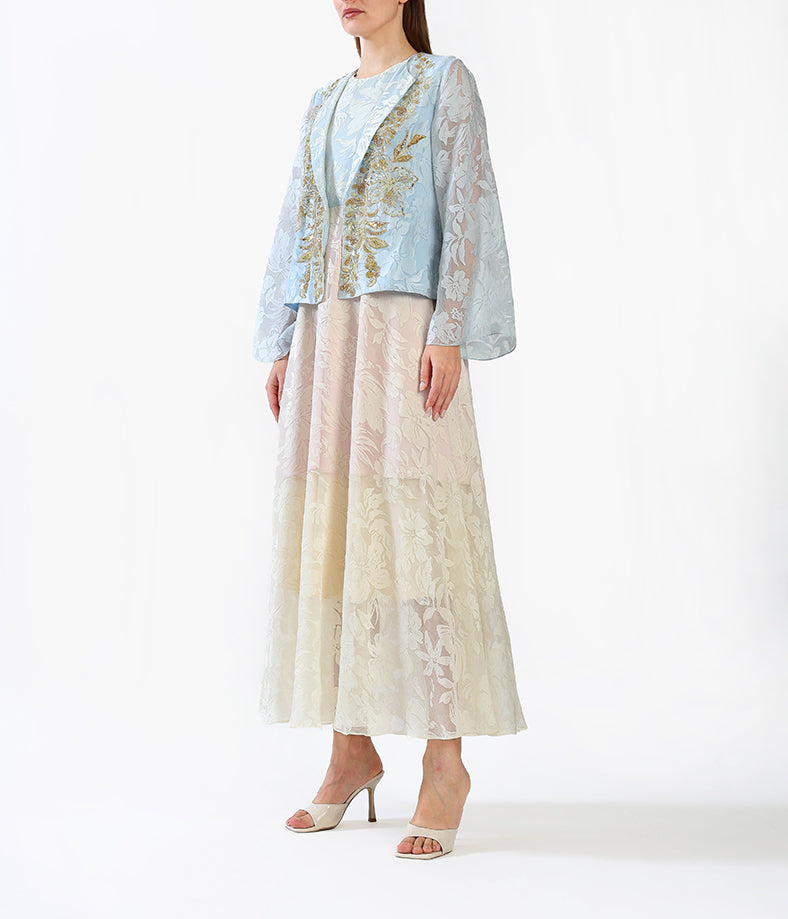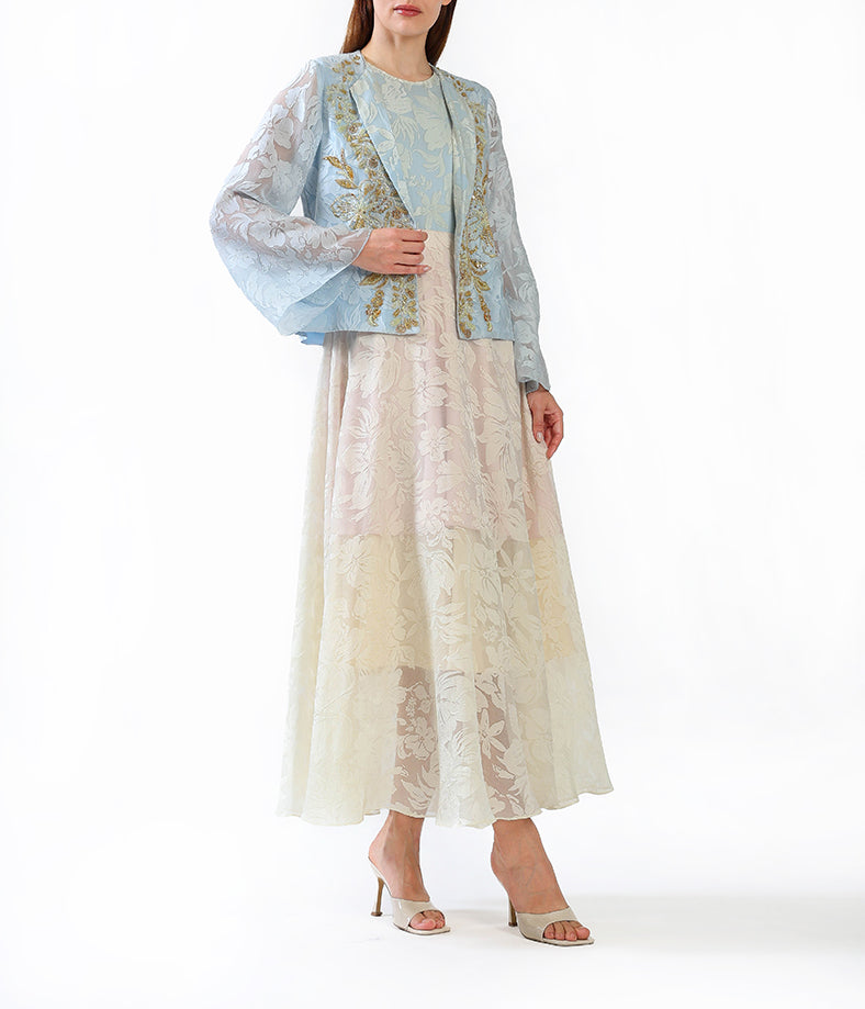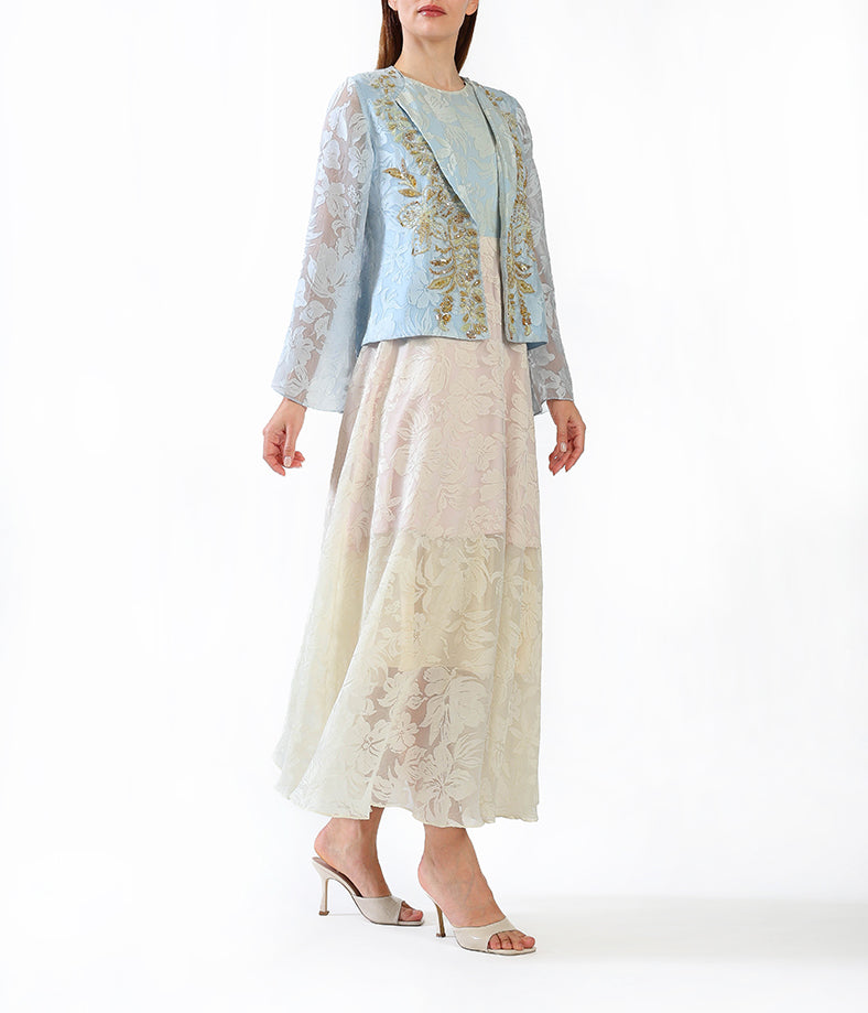 Elegant and refined, this dress features a soft powder blue floral jacquard overlay paired with a champagne-toned inner dress.