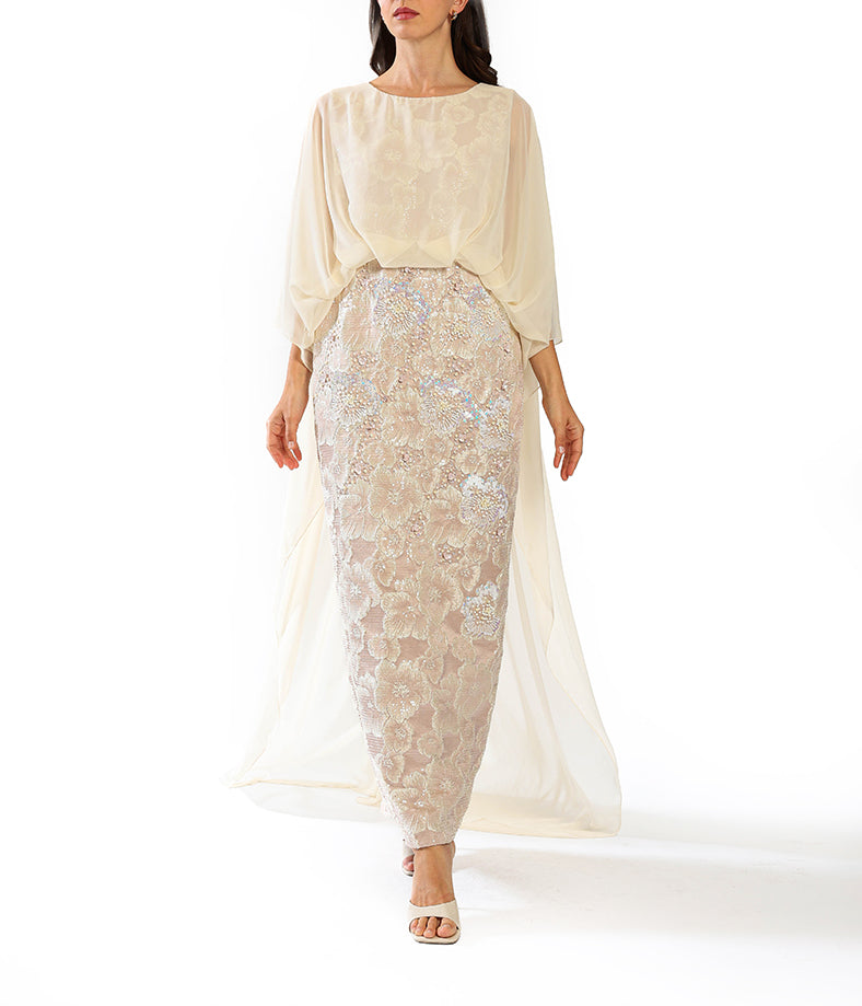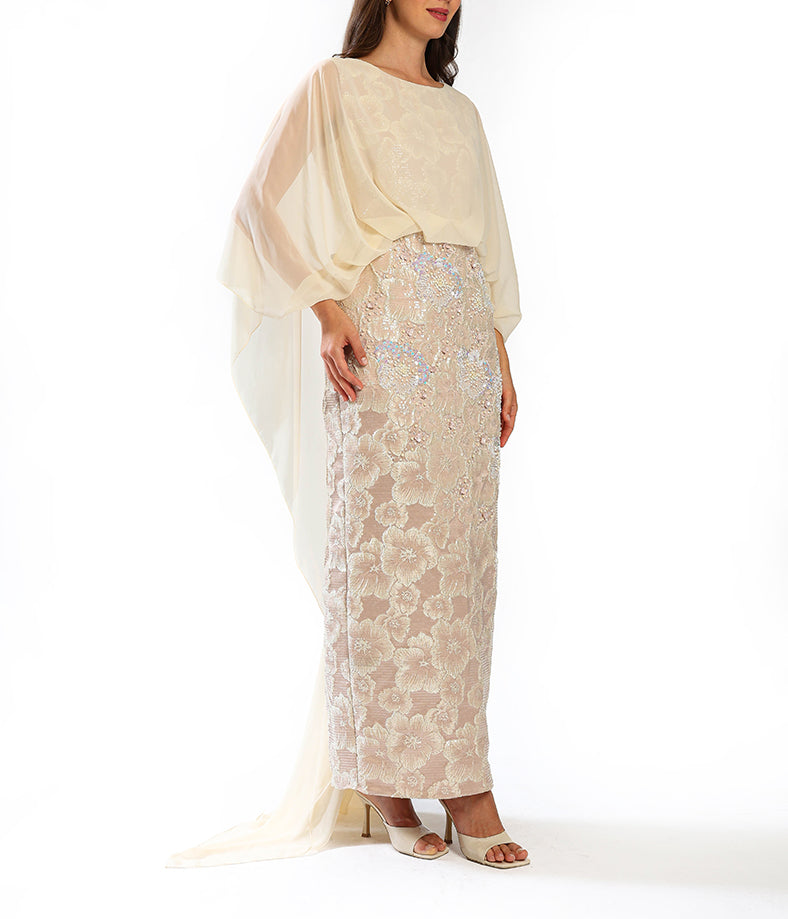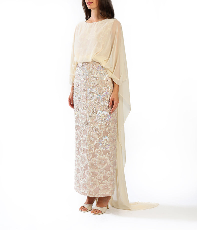 An elegant pencil-cut dress featuring a delicately embellished floral skirt and a soft, chiffon cape overlay.