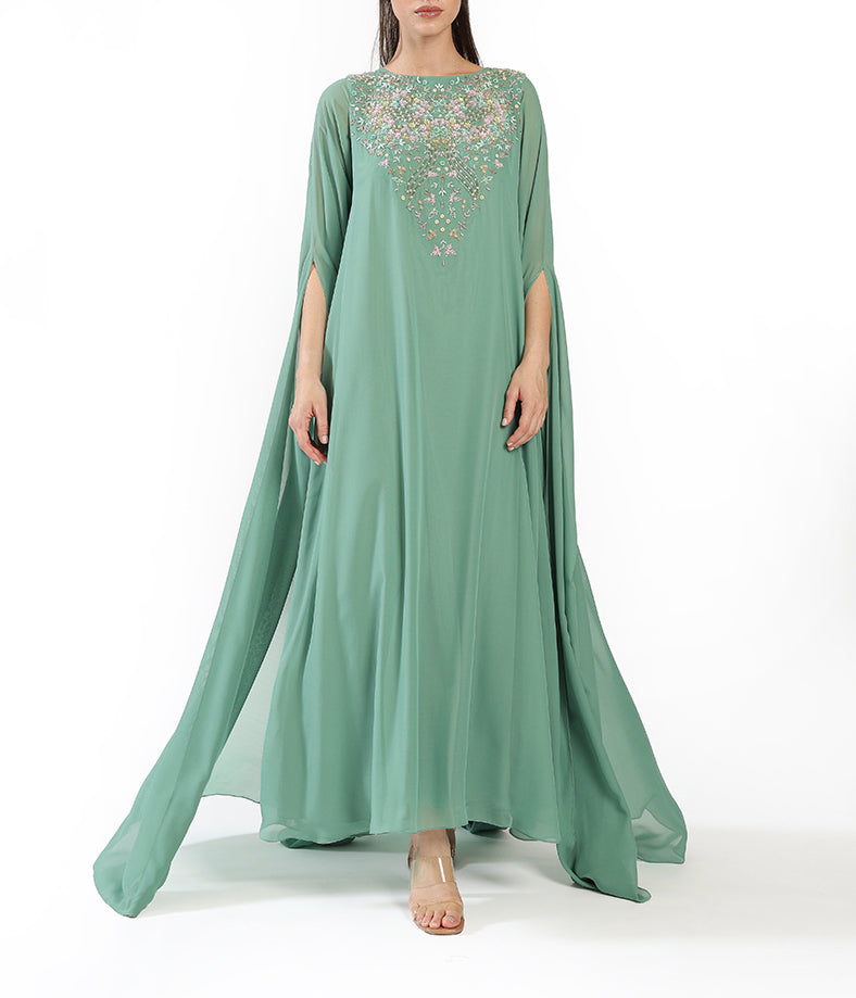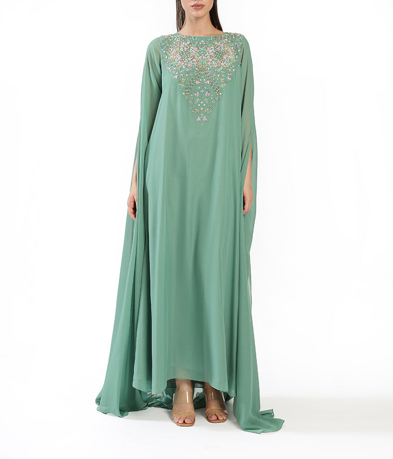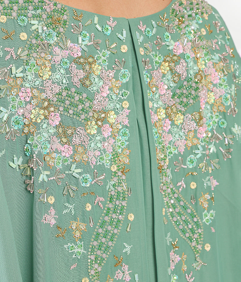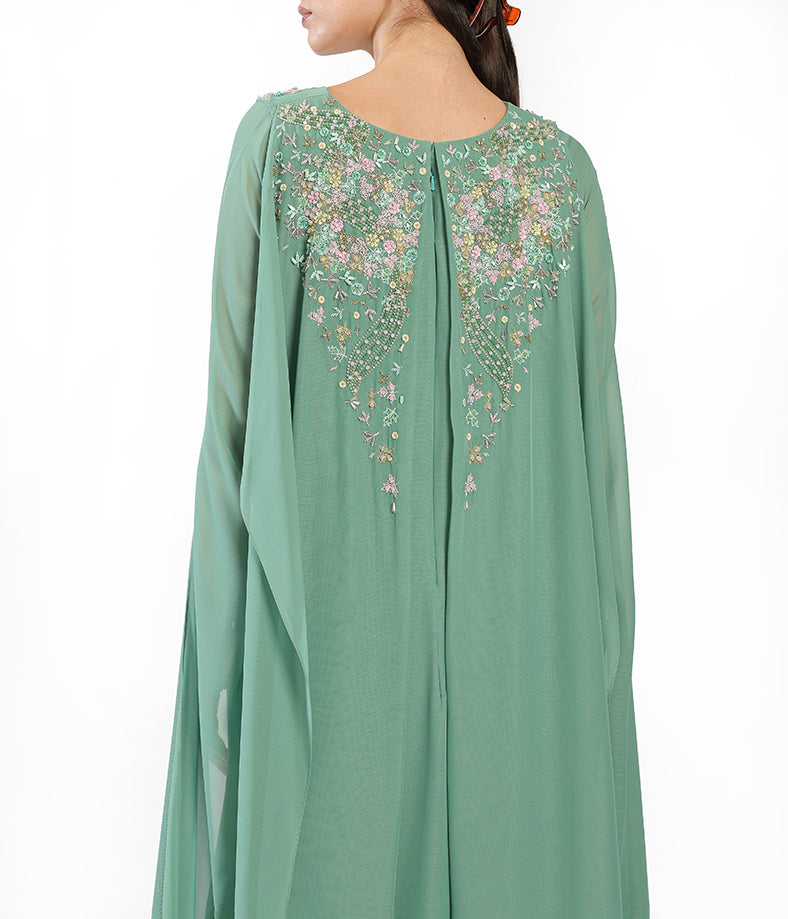 Evergreen chiffon sleeves cape dress with modern minimalism hand-embroidered florals bloom.