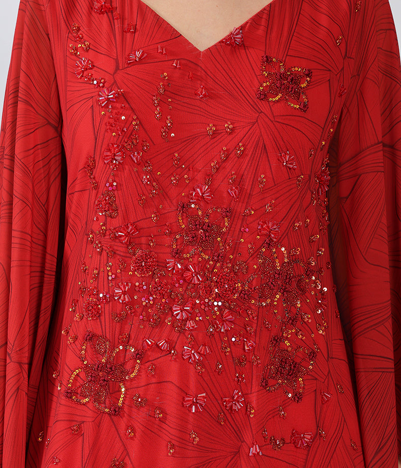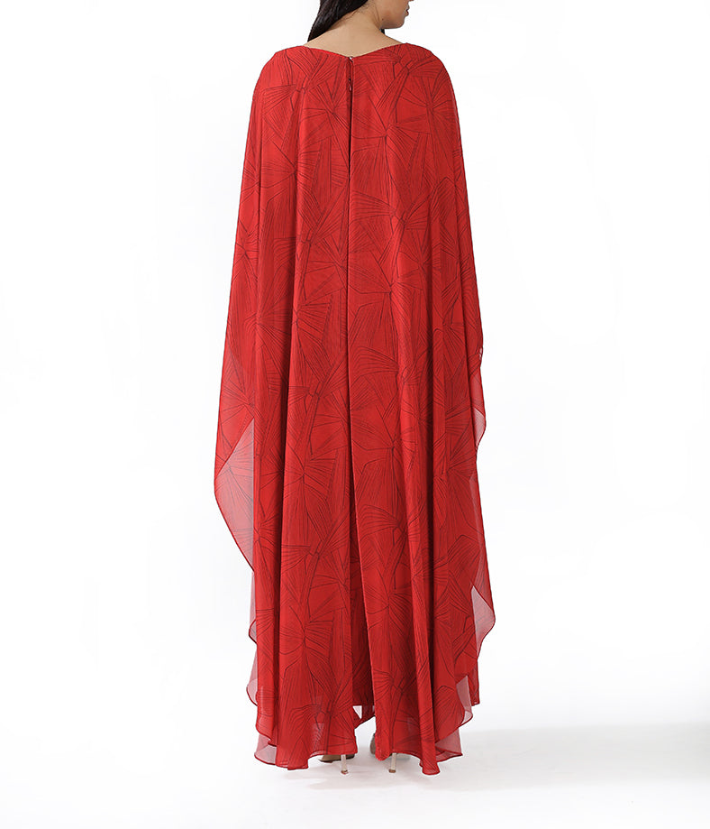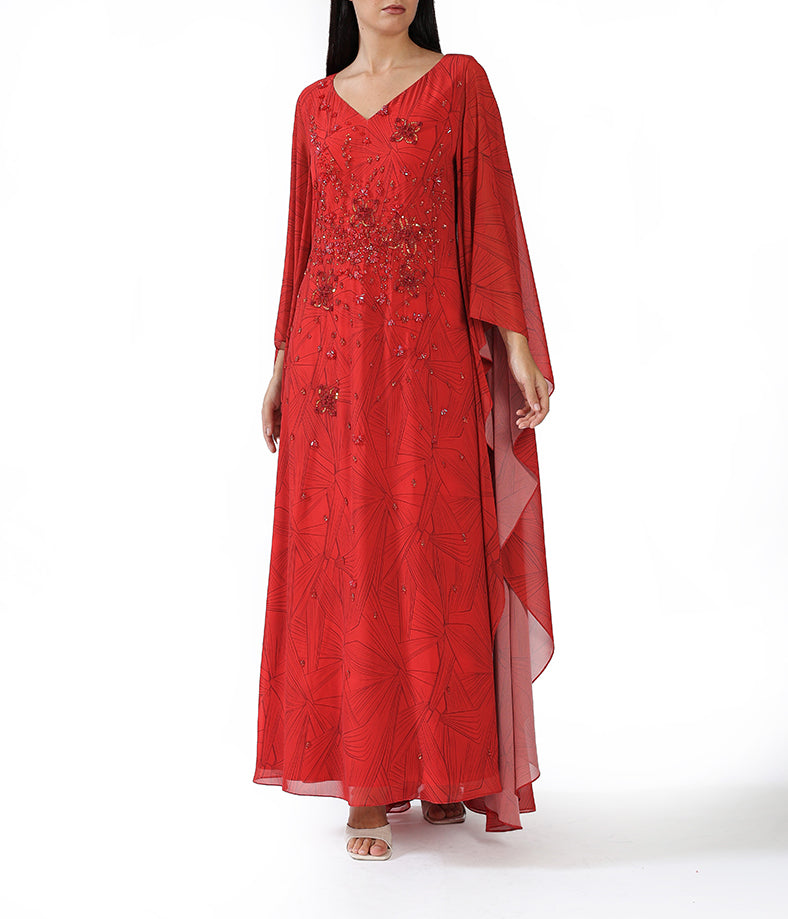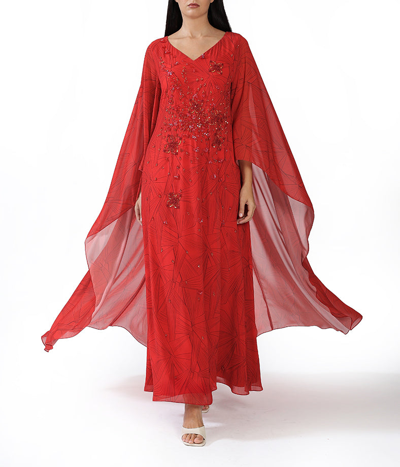 Chiffon Customized Prints Cape Dress with Handmade Embellishments.
