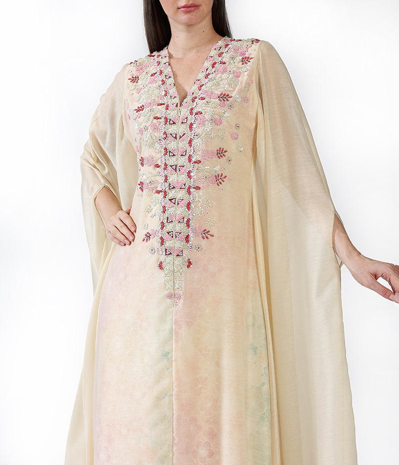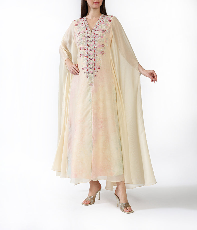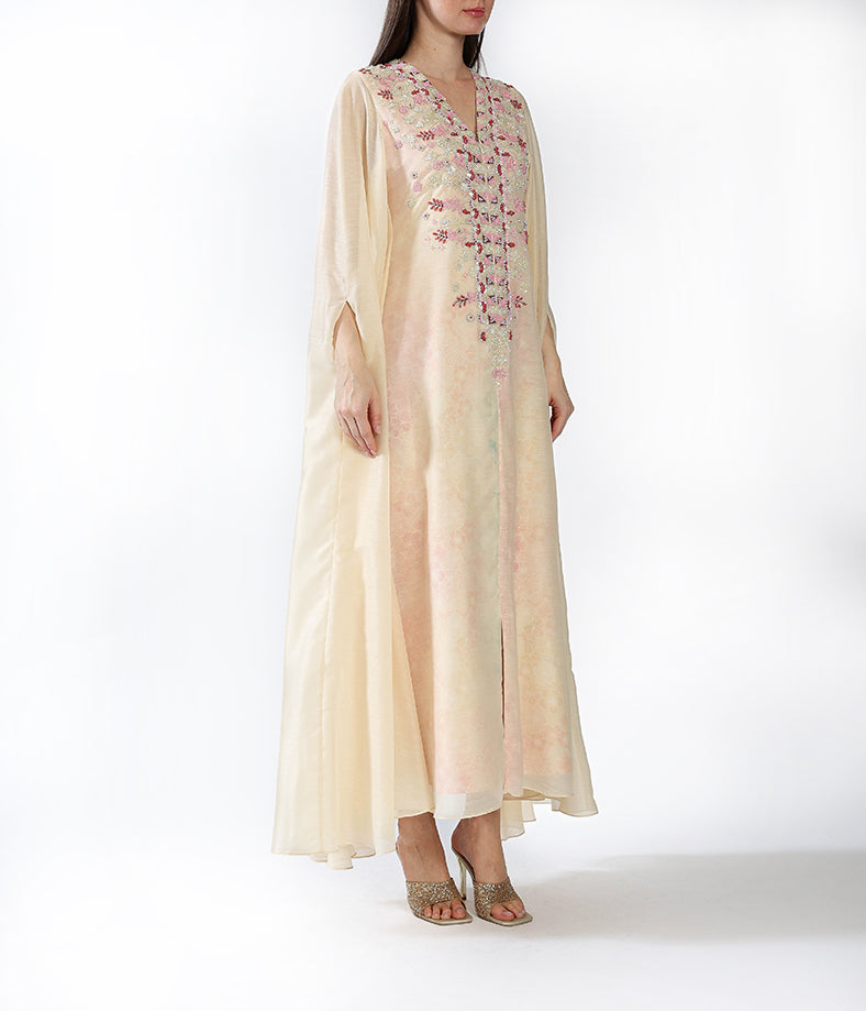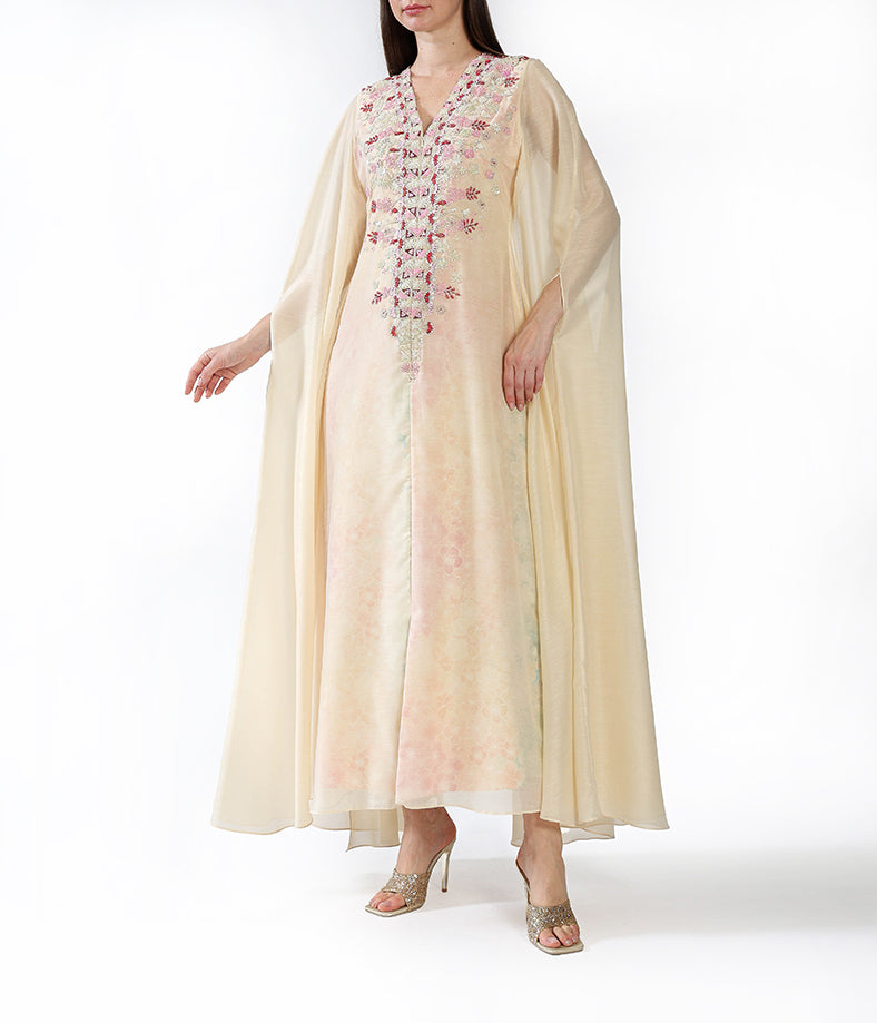 Butter cream chiffon cape with floral embroidery and customized prints.
