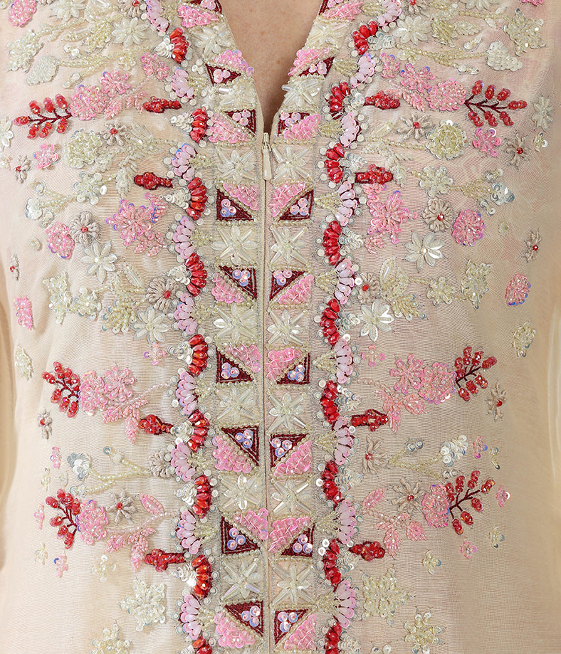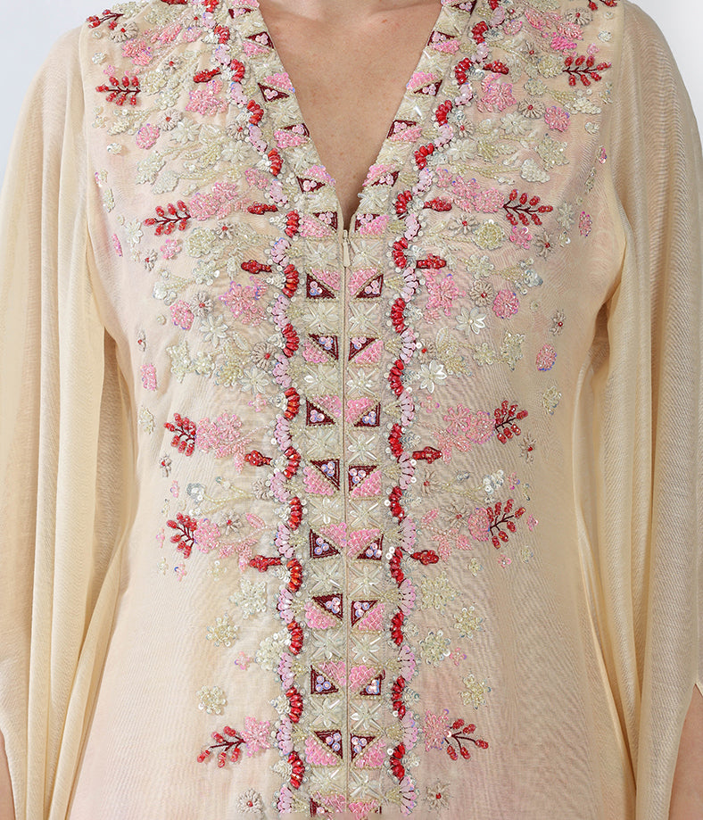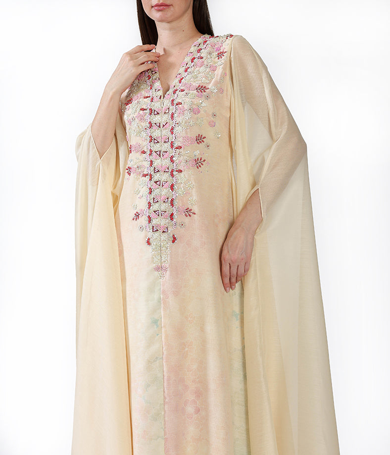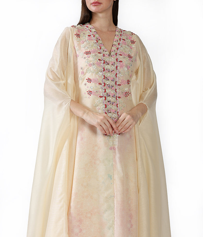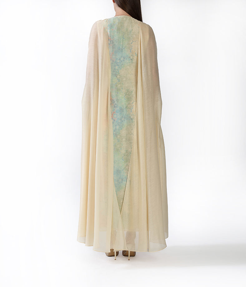 Butter cream chiffon cape with floral embroidery and customized prints.
