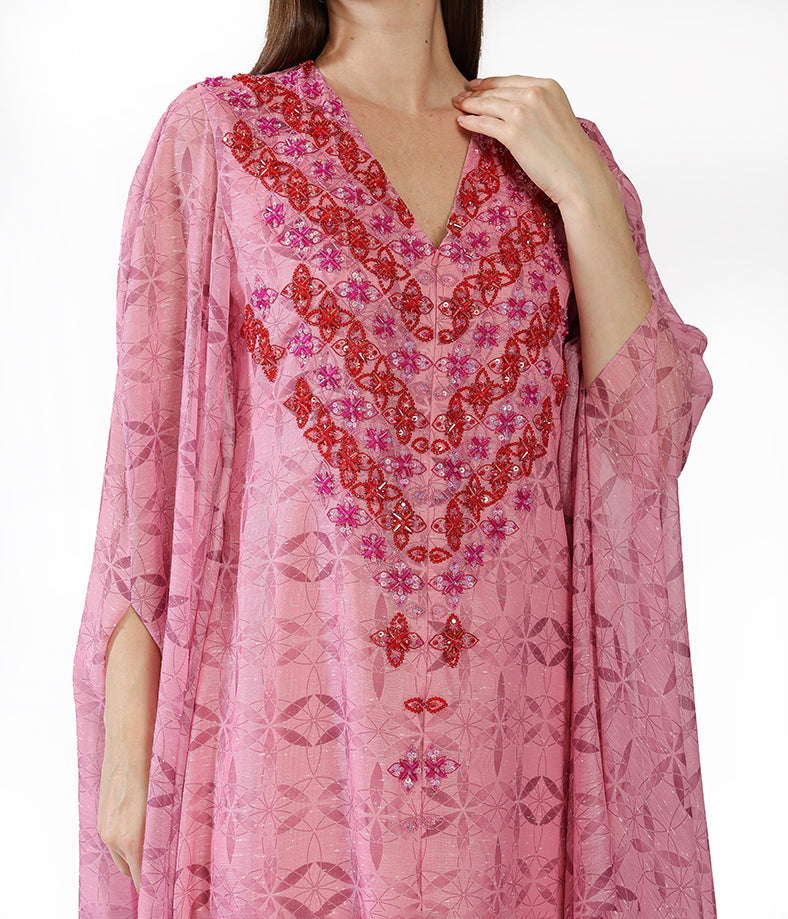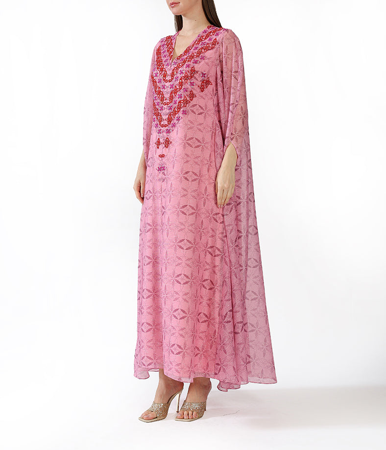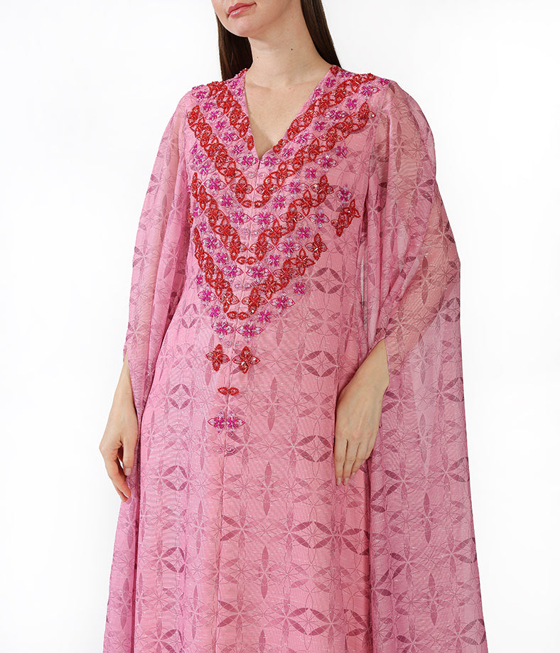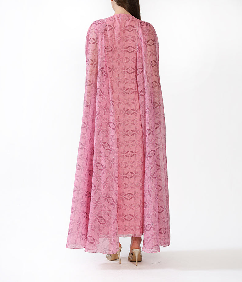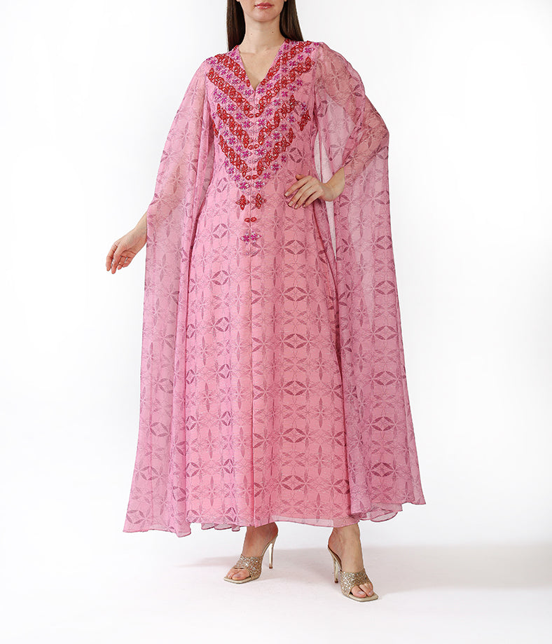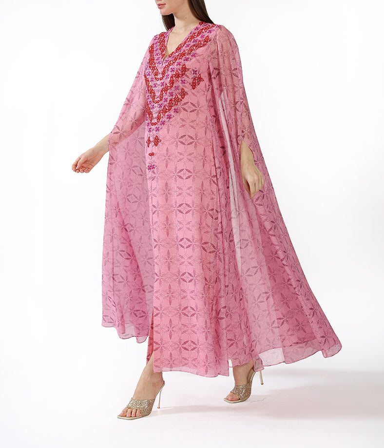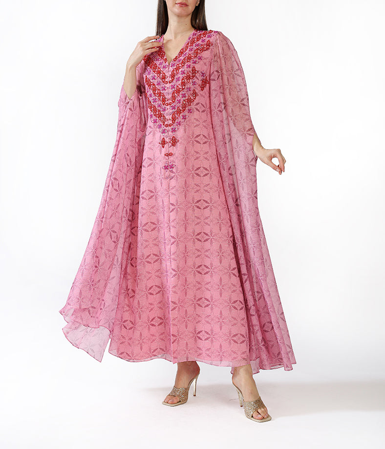 Fuchsia Customized Chiffon Prints  Floral Cape Embroidery.