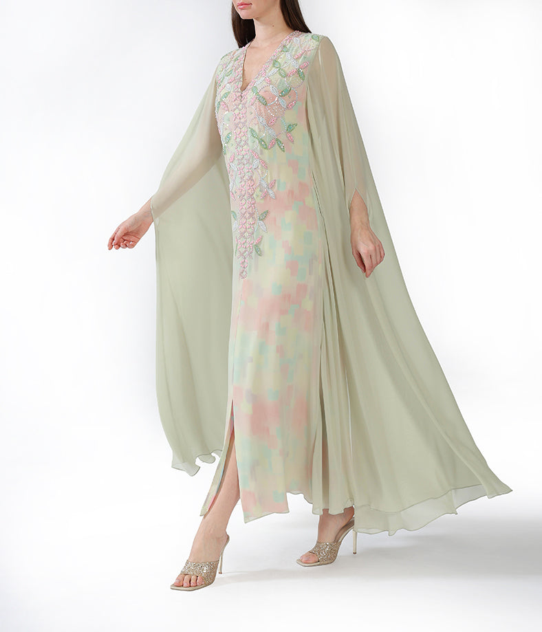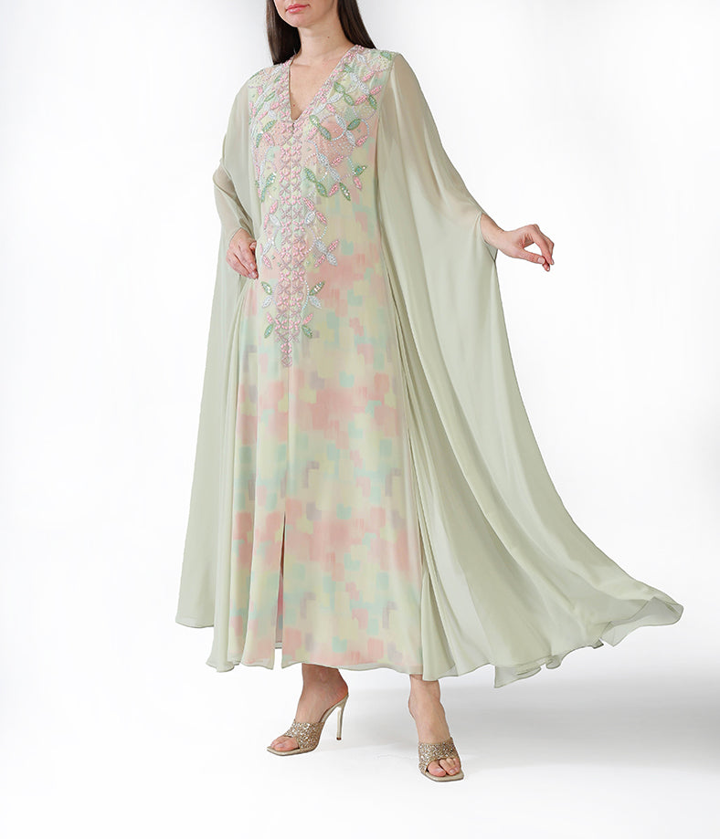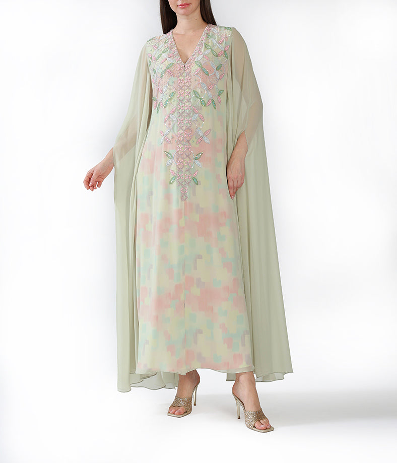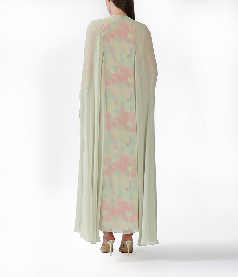 Pastel Mint Chiffon with Multi Color Embellishments Printed Lining and Cape Sleeves
