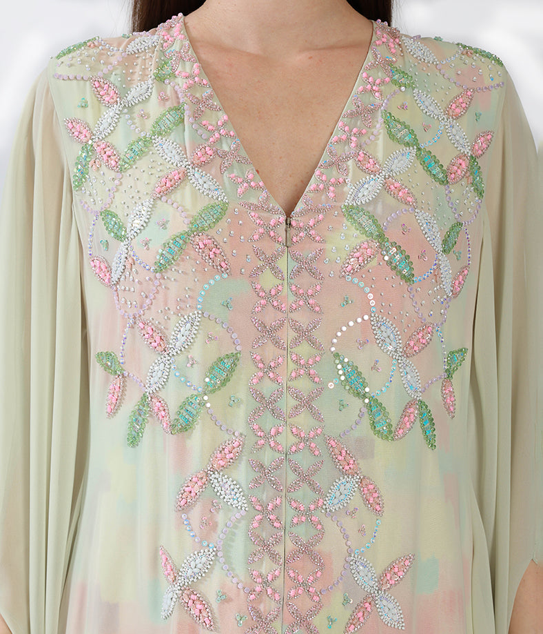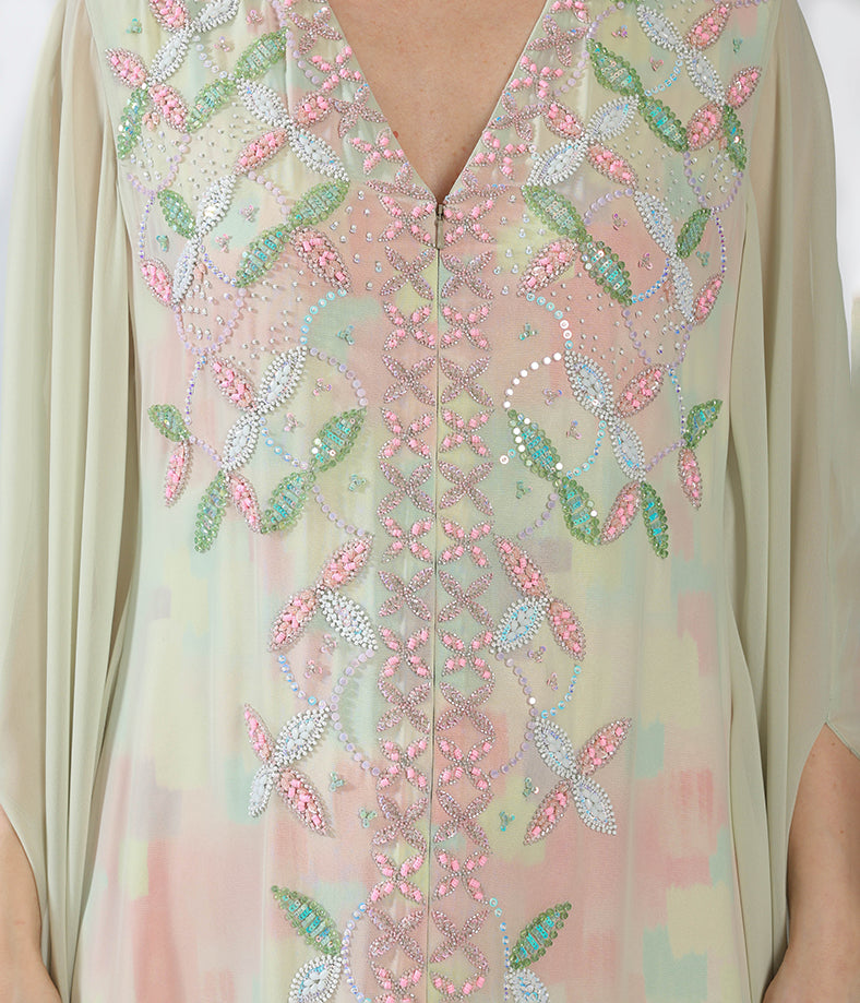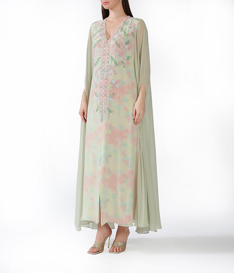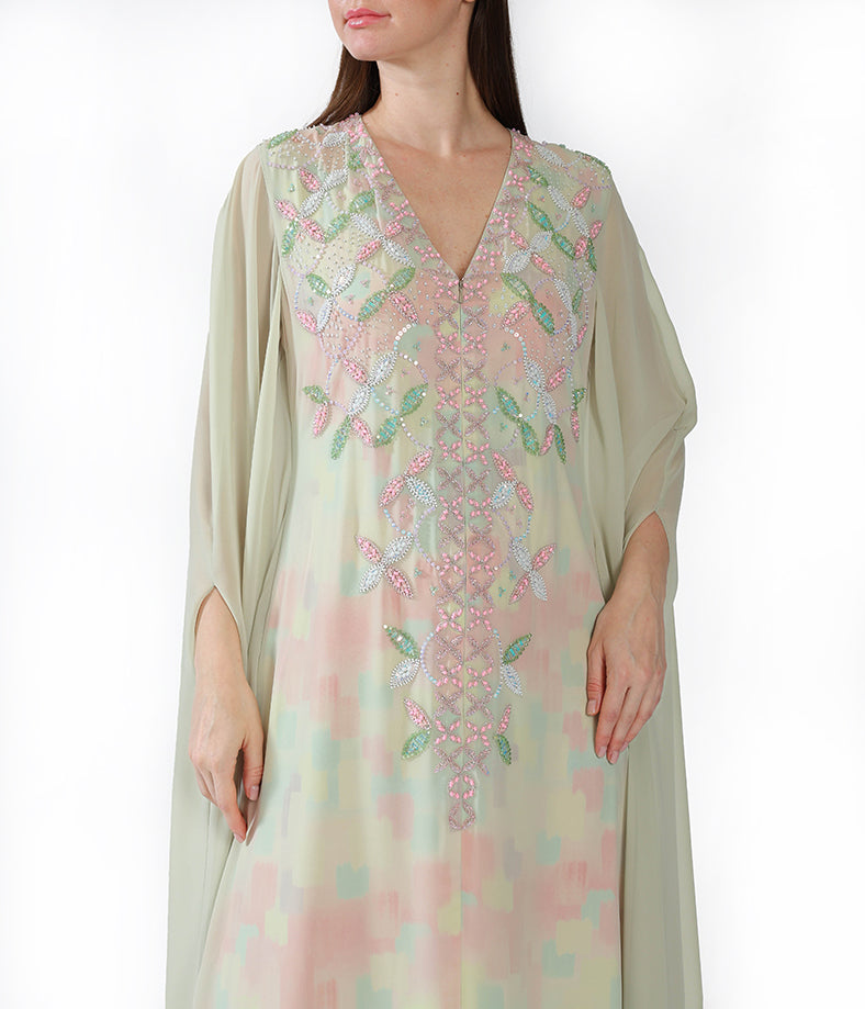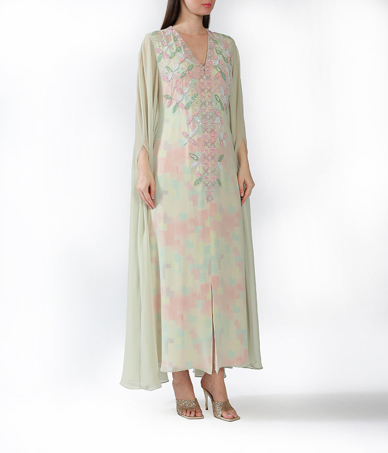 Pastel Mint Chiffon with Multi Color Embellishments Printed Lining and Cape Sleeves
