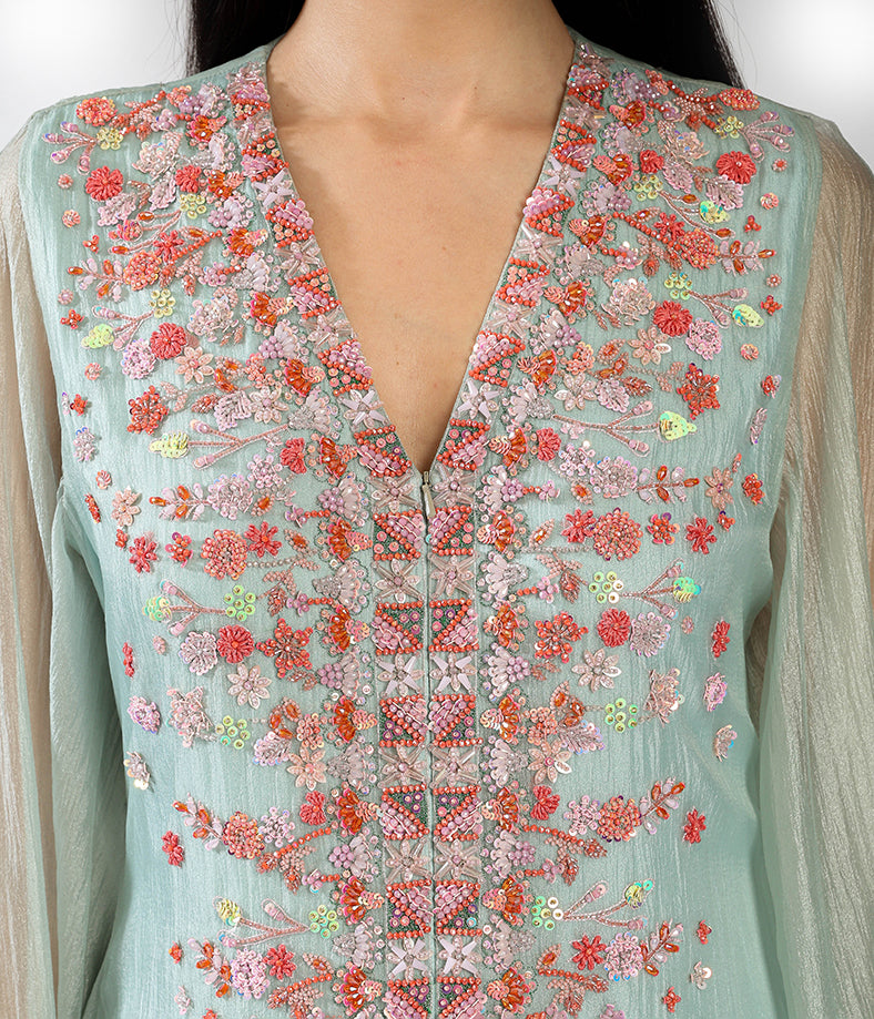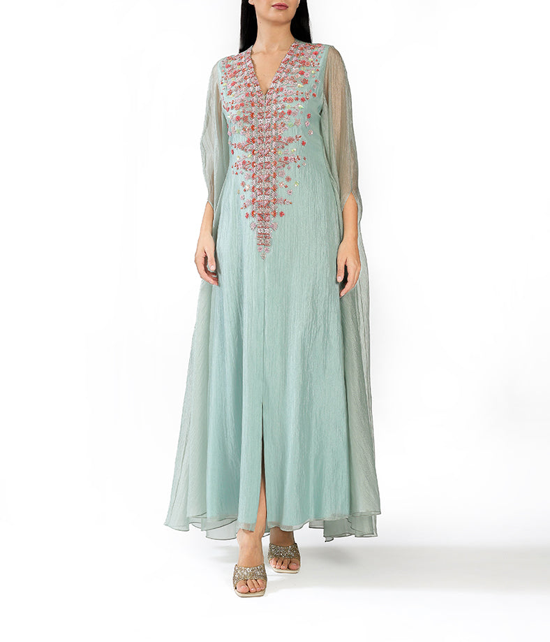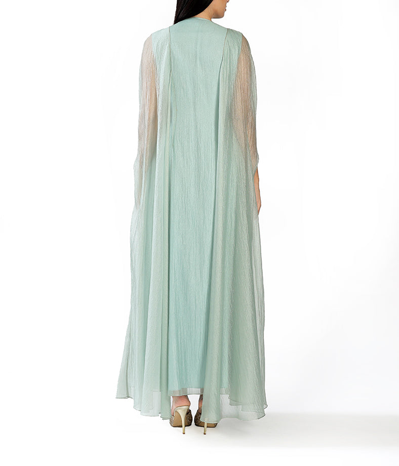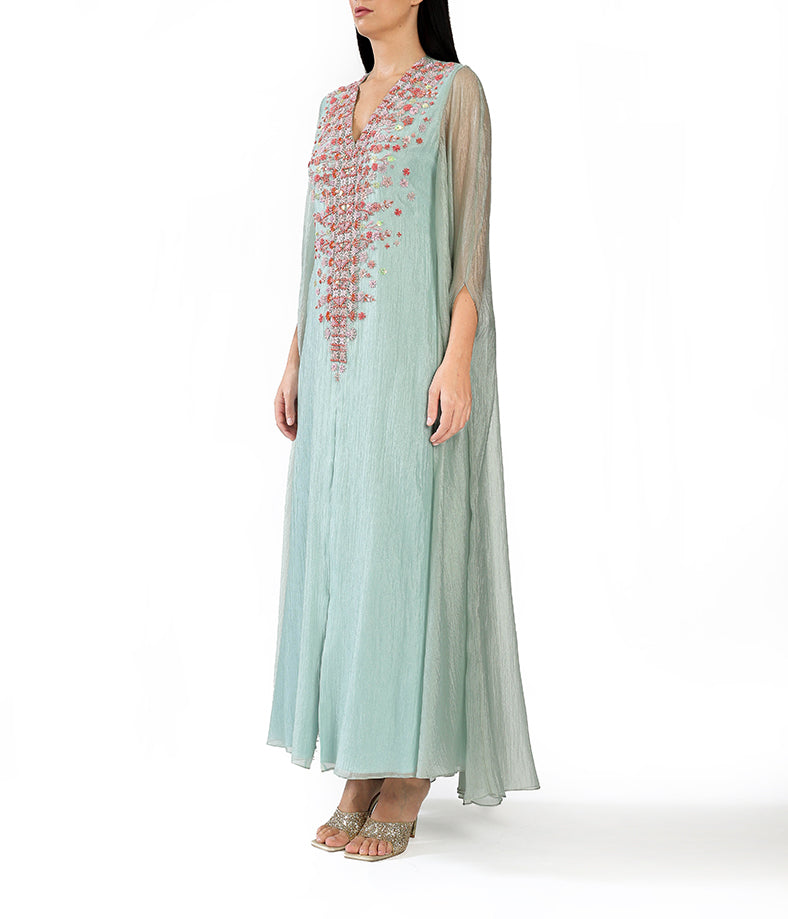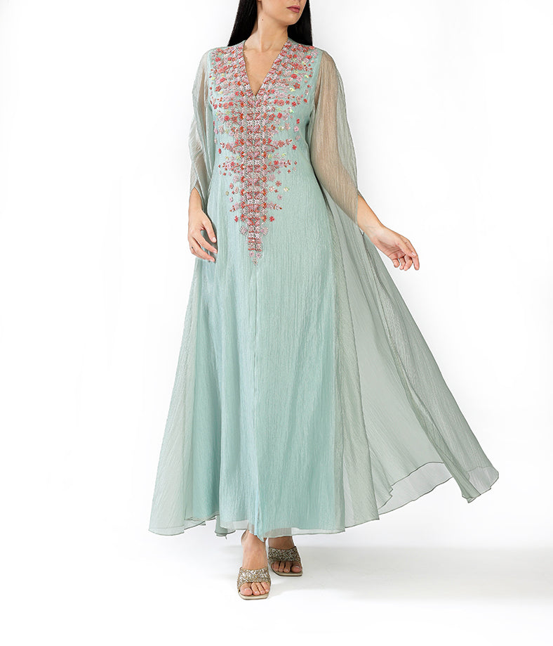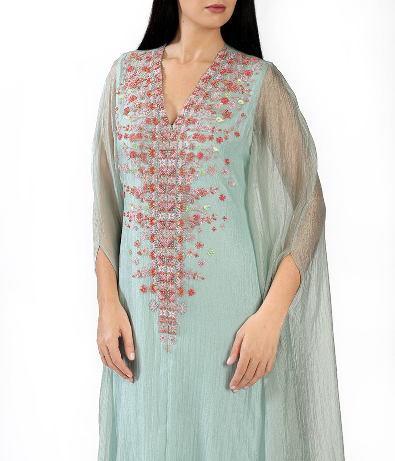 Pastel mint green light organza cape with mini geometrical floral embroidery.