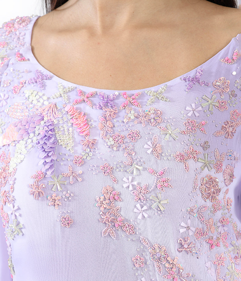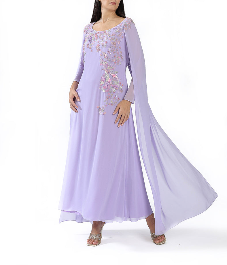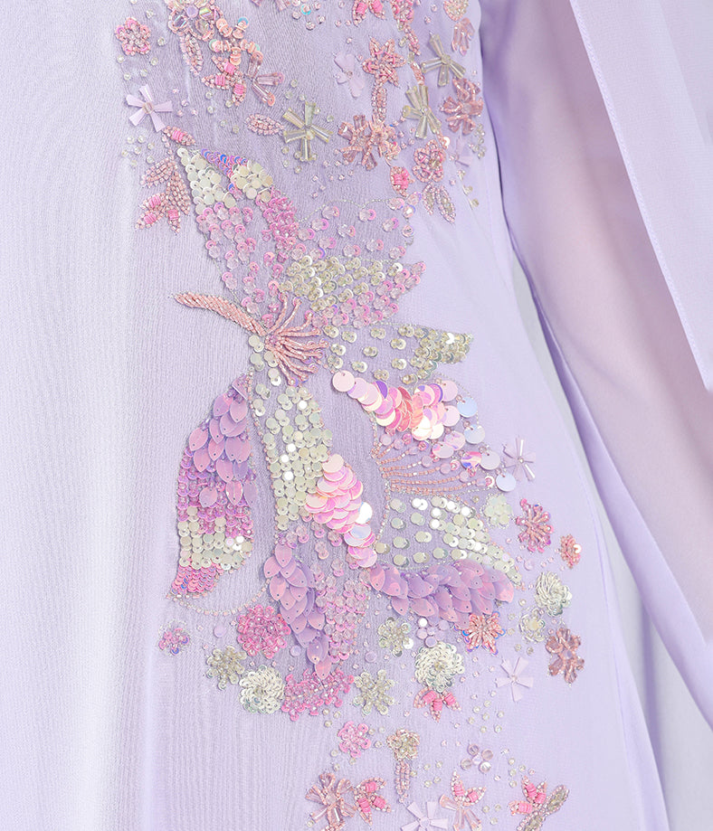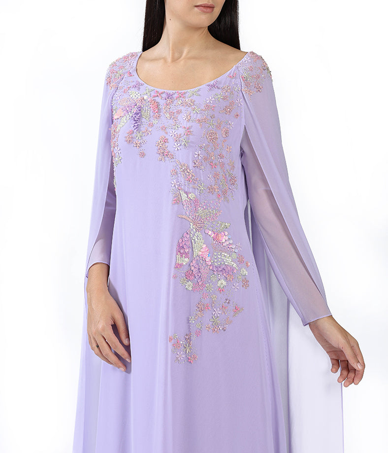 Lilac chiffon cape-sleeve dress with delicate multi-colored sequin floral embroidery.