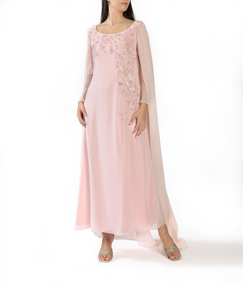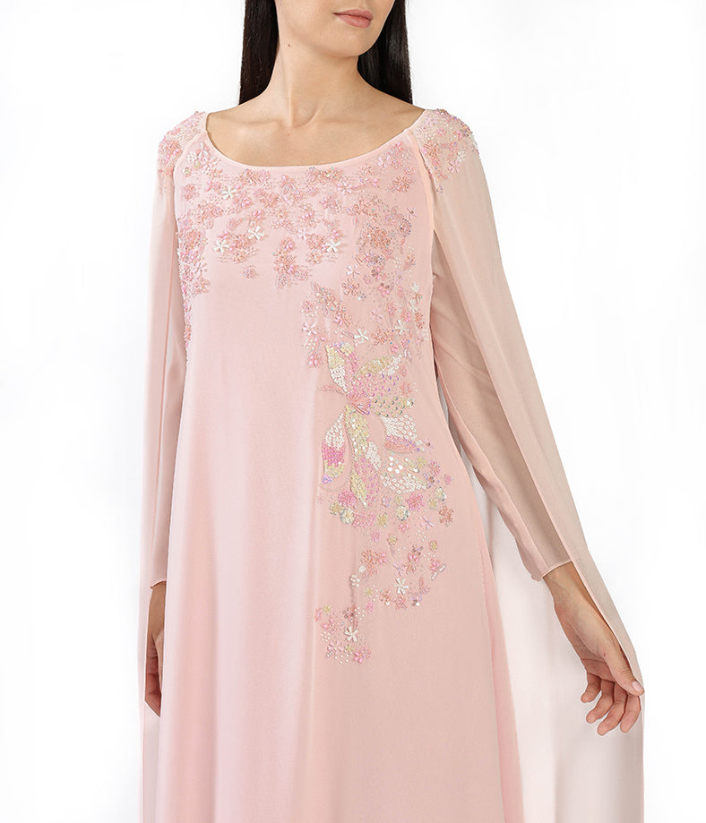 Light pink chiffon cape-sleeve dress with delicate multi-colored sequin floral embroidery.