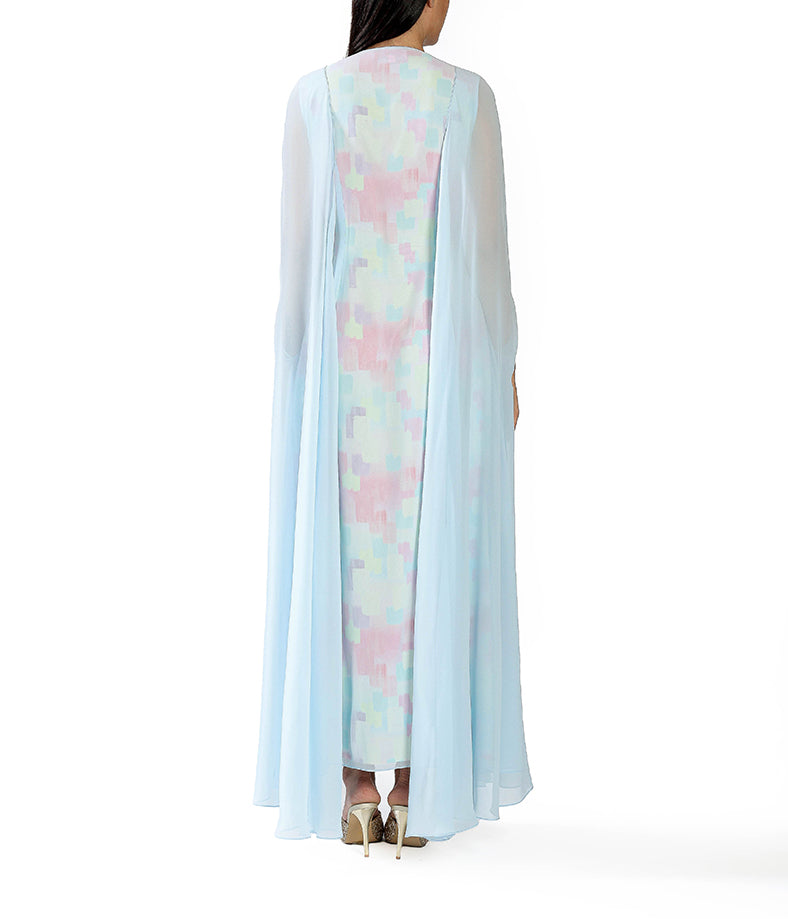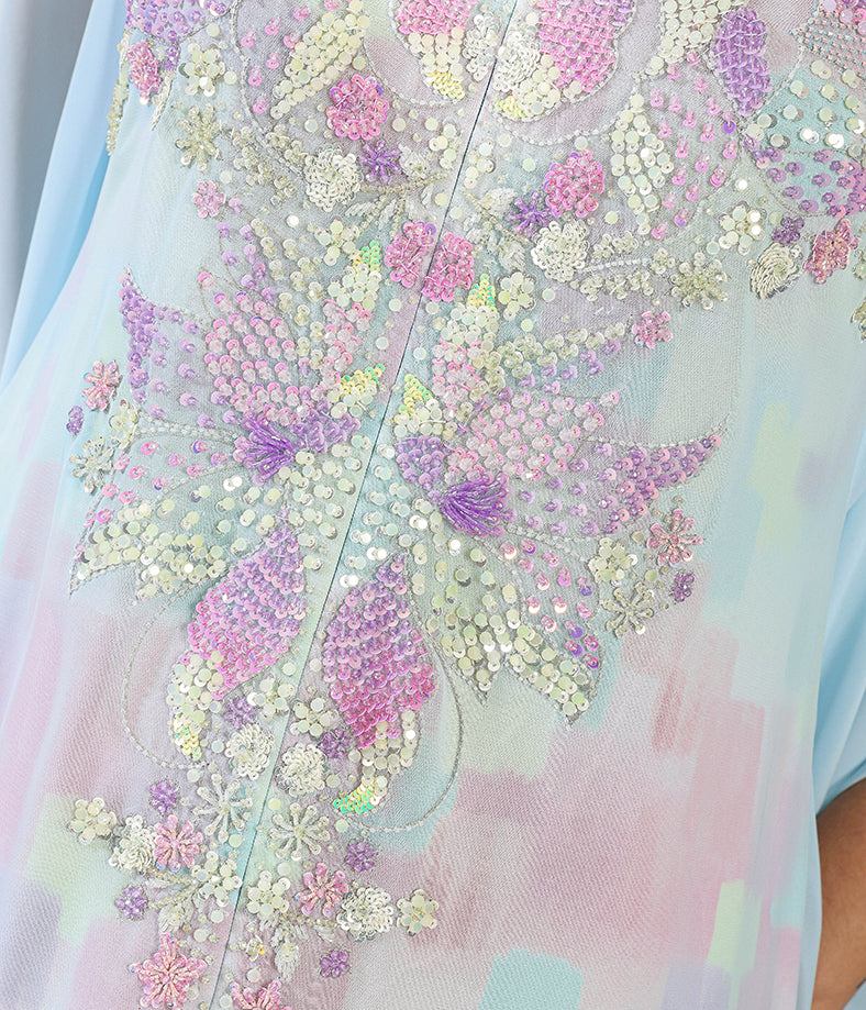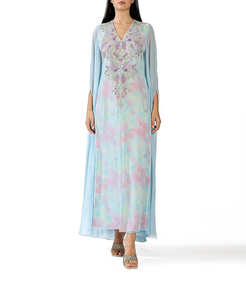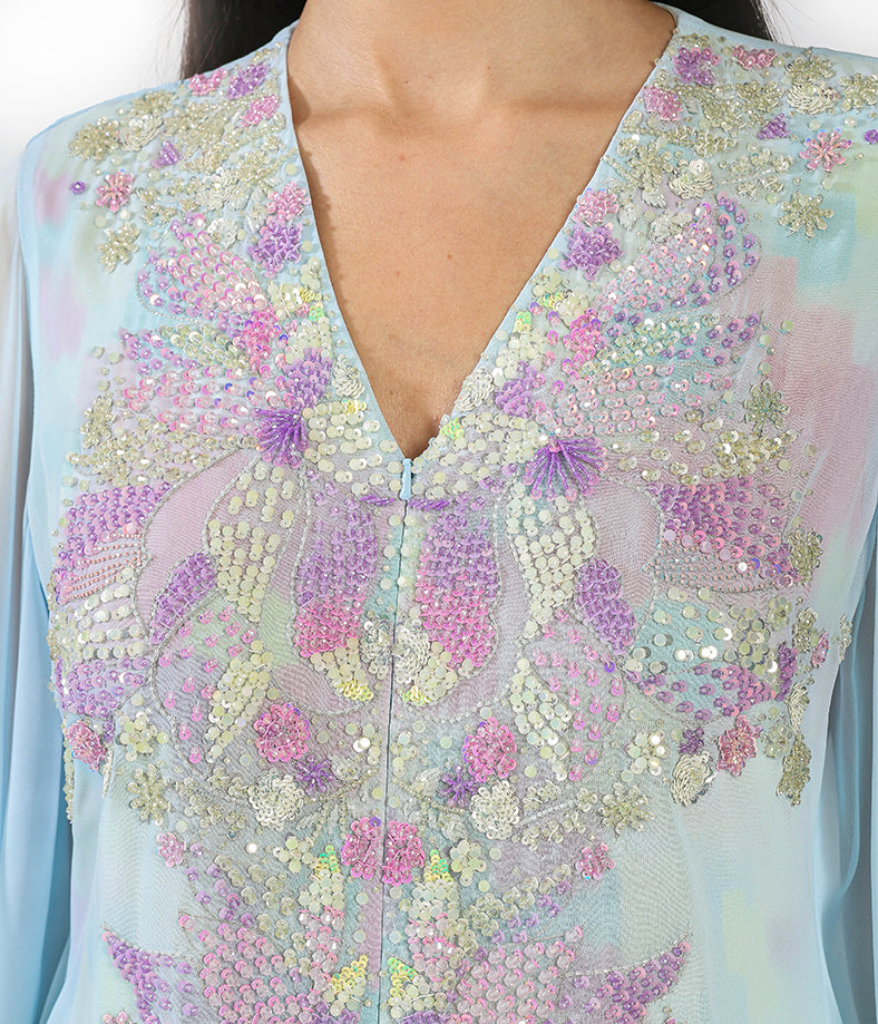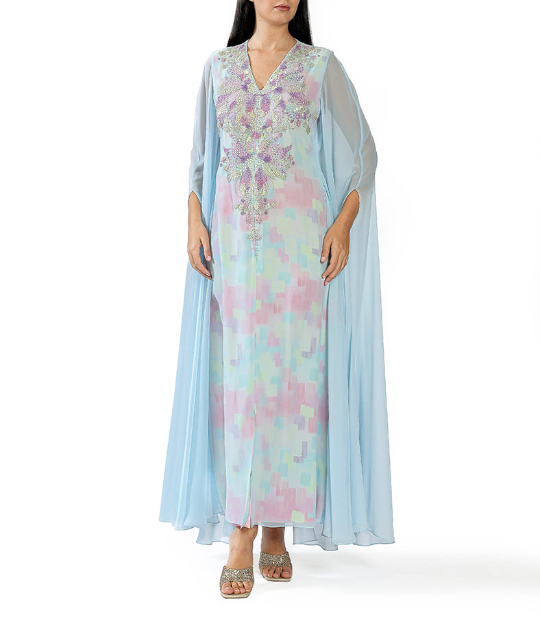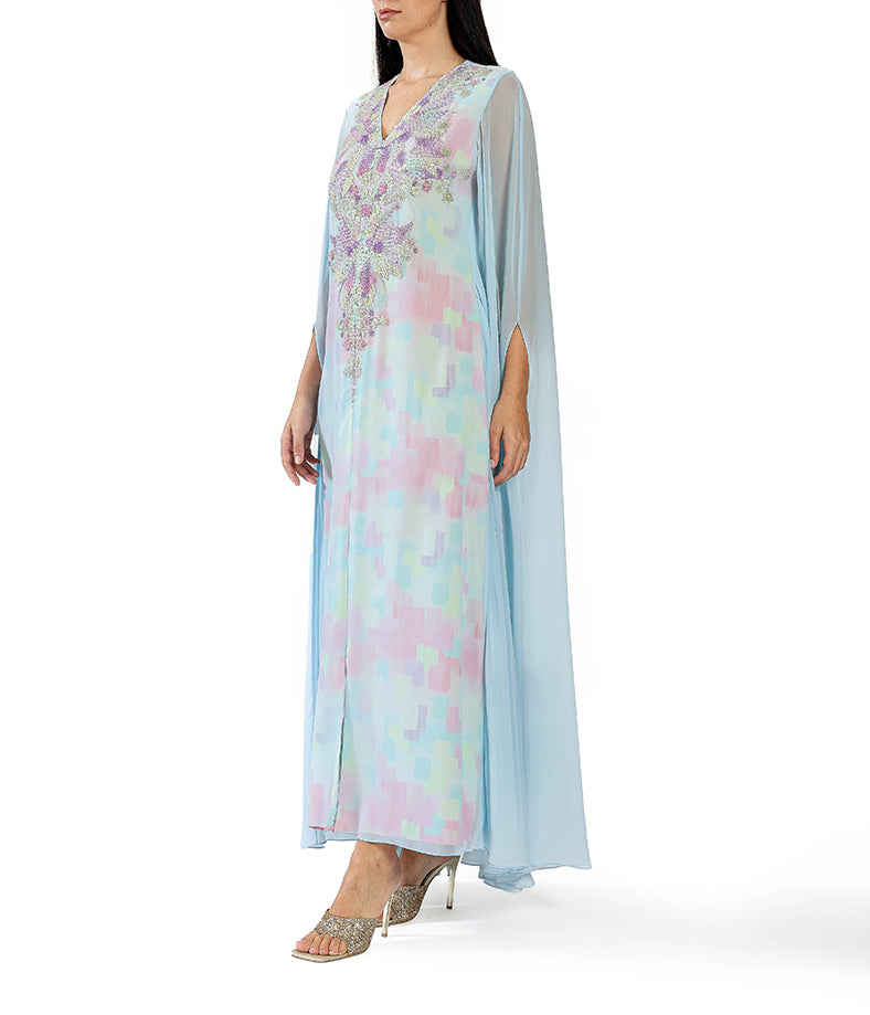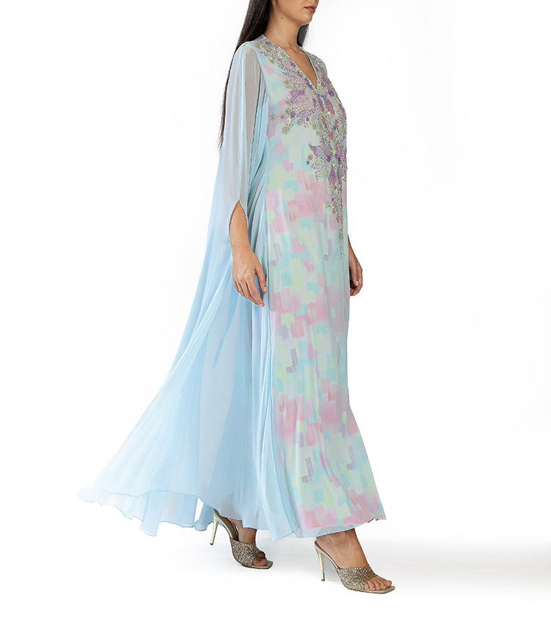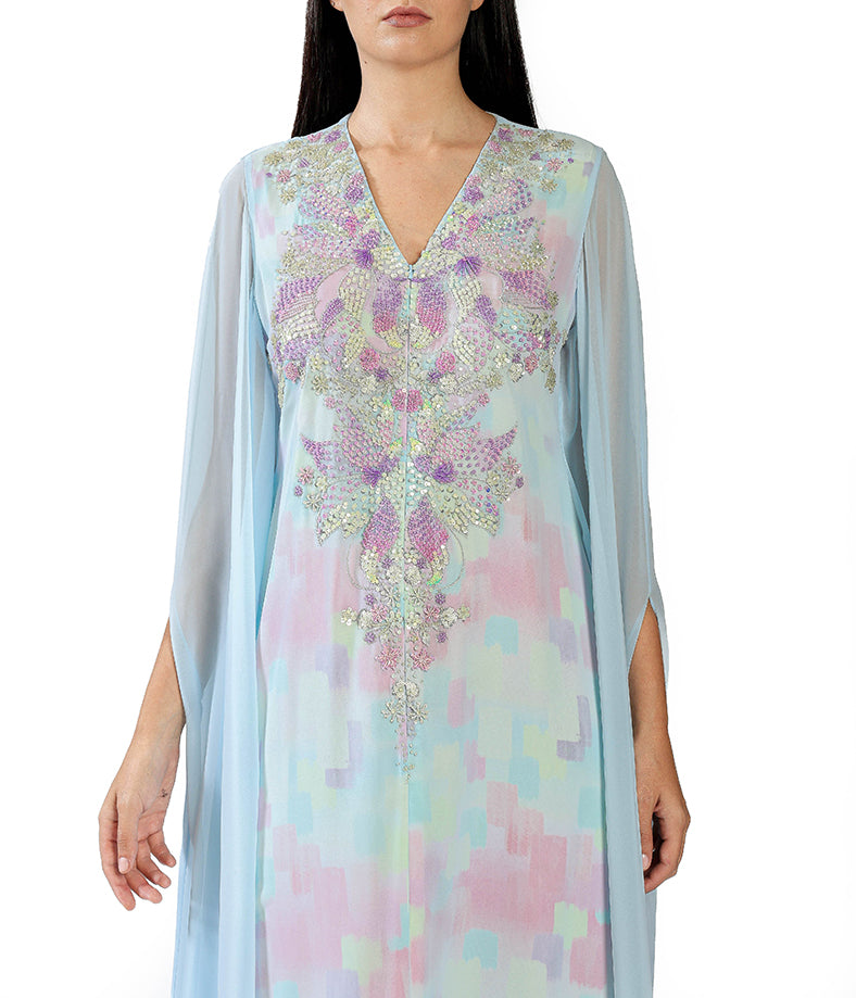 Tiffany Blue Chiffon with Embellished Details, Printed Lining, and Elegant Cape Sleeves.