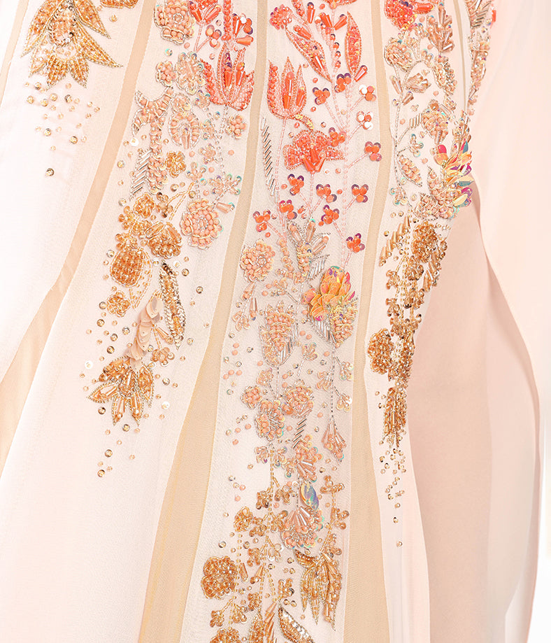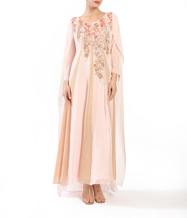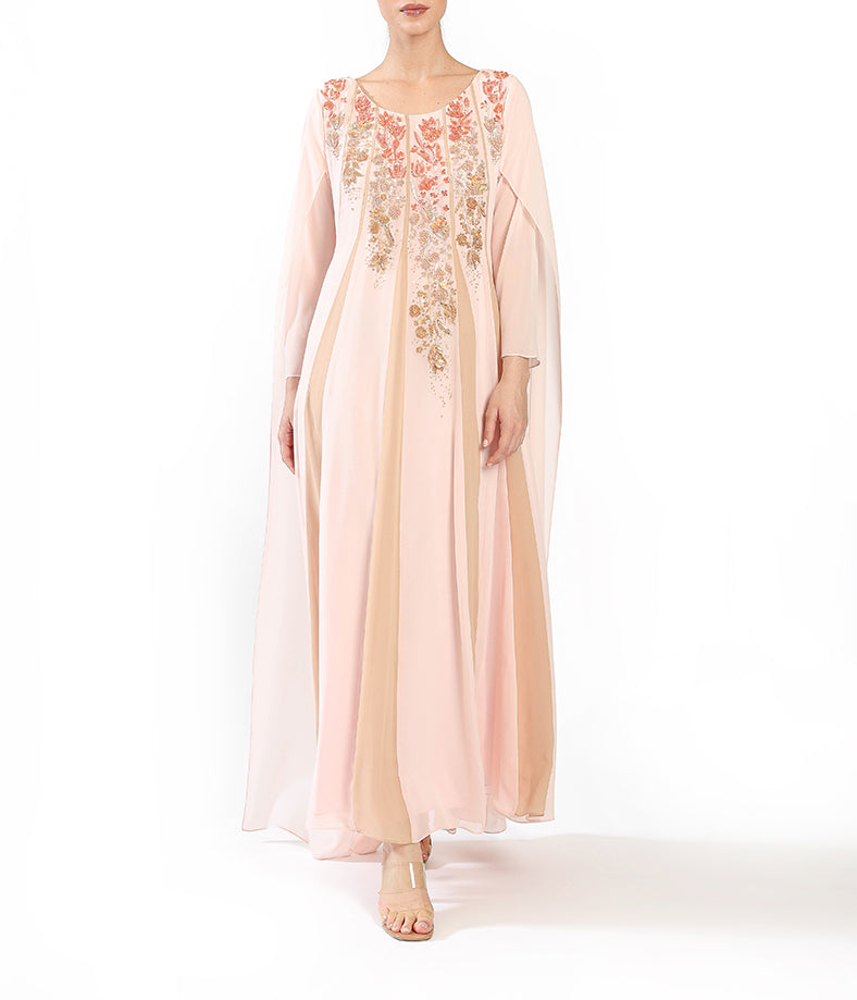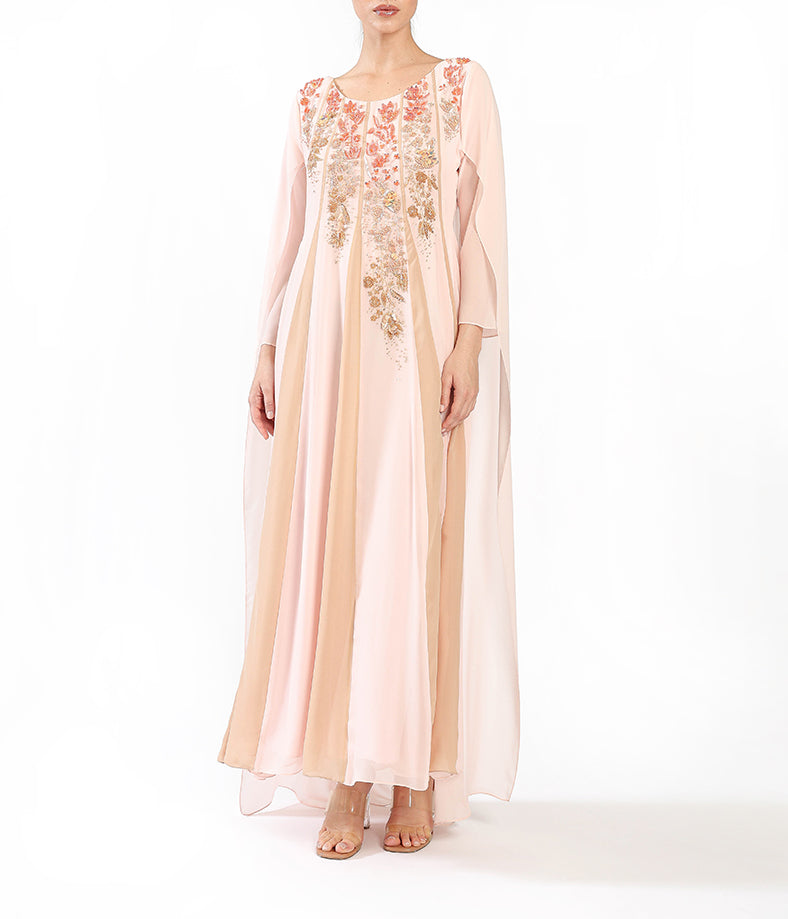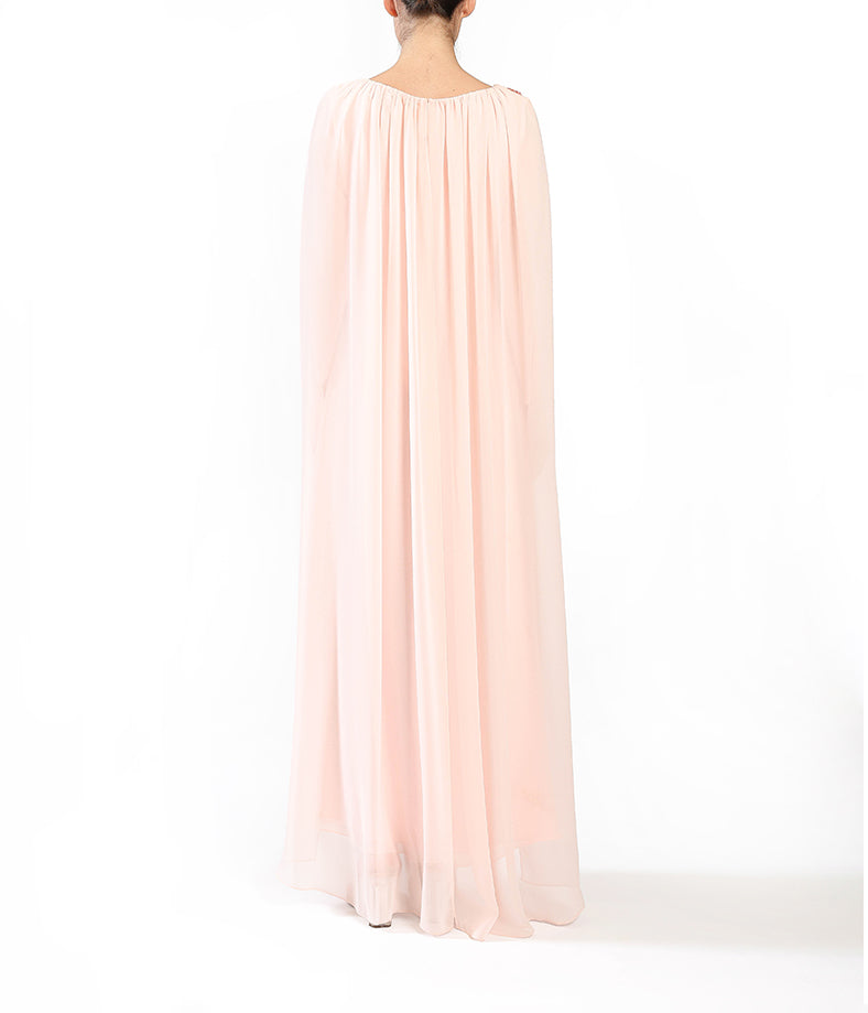 Blush chiffon  with flowing cape sleeves, pleated illusion texture, and  floral embroidery