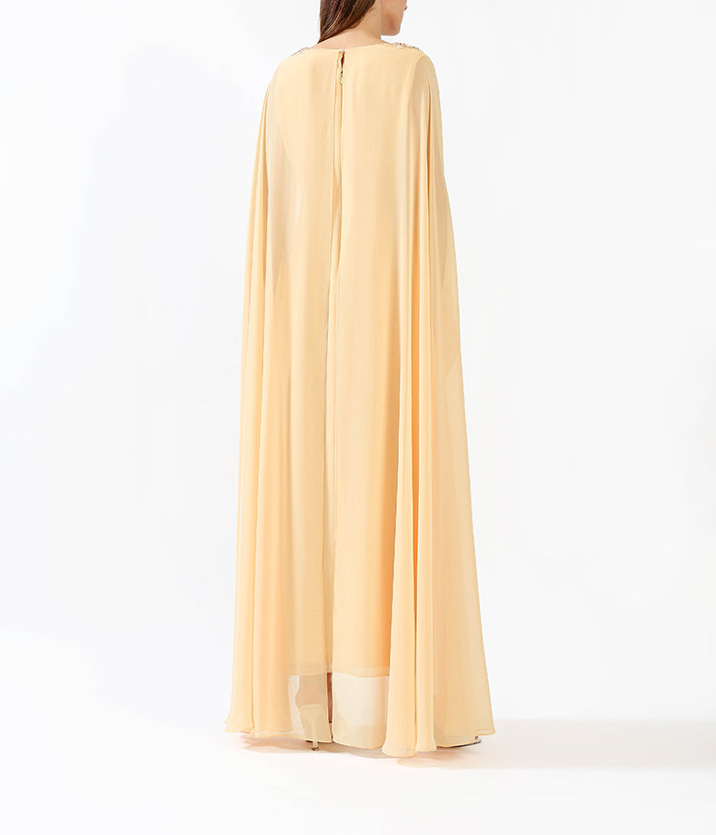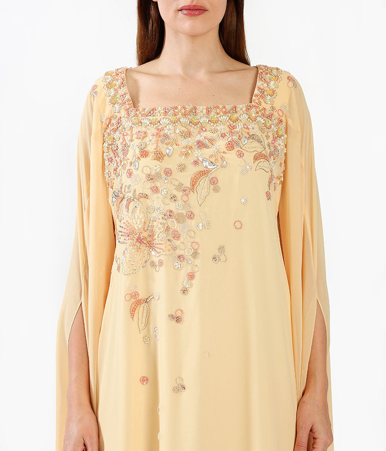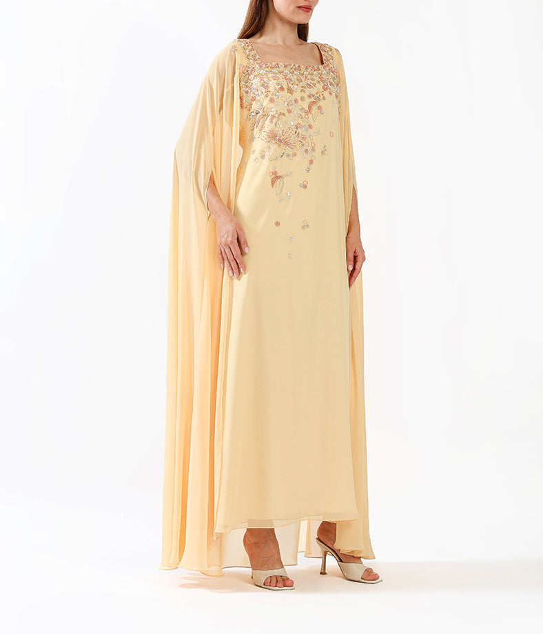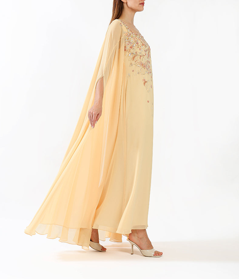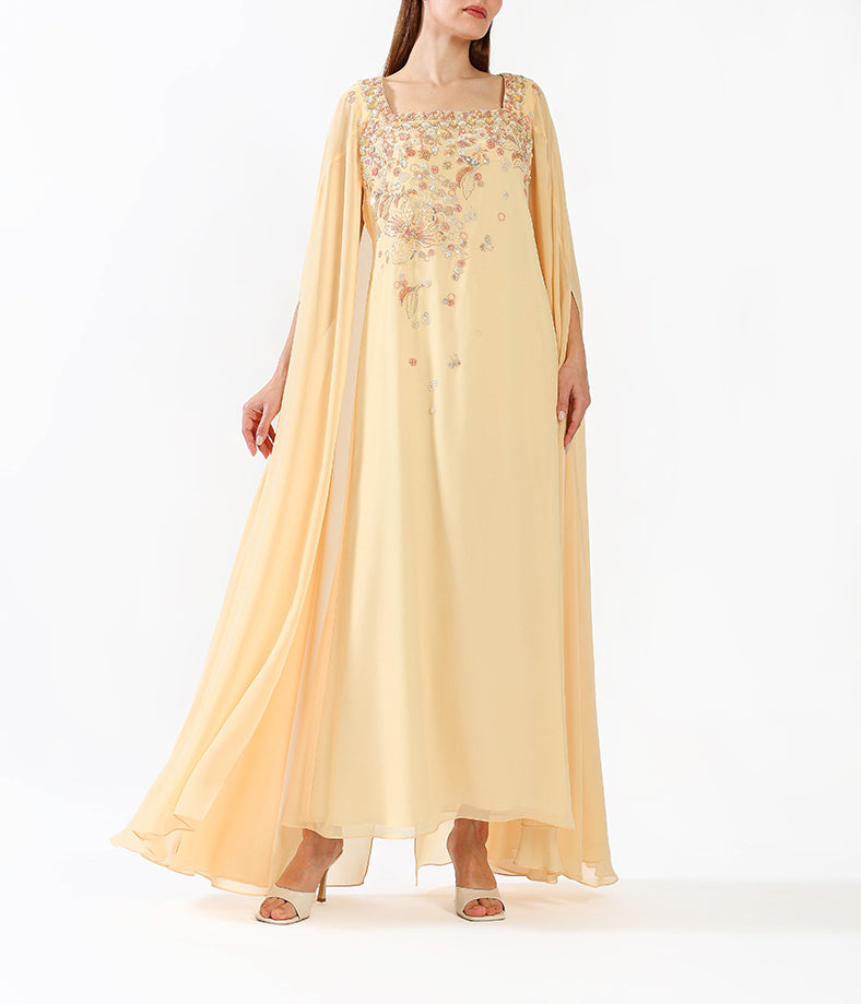 Light chiffon cape-sleeve dress with hand-made floral embellishments.