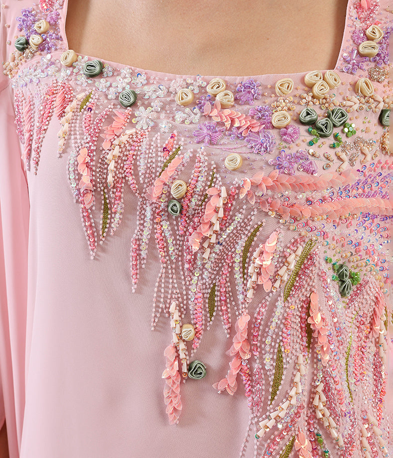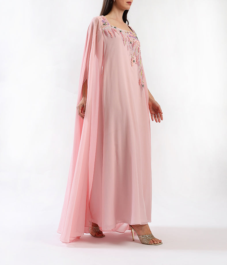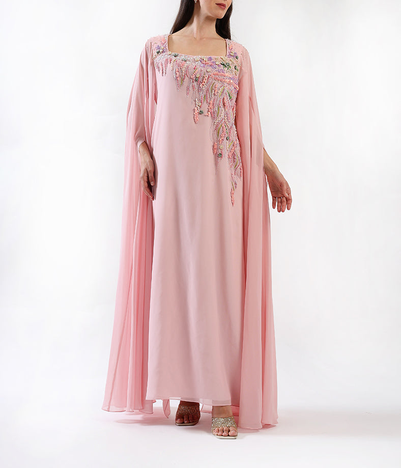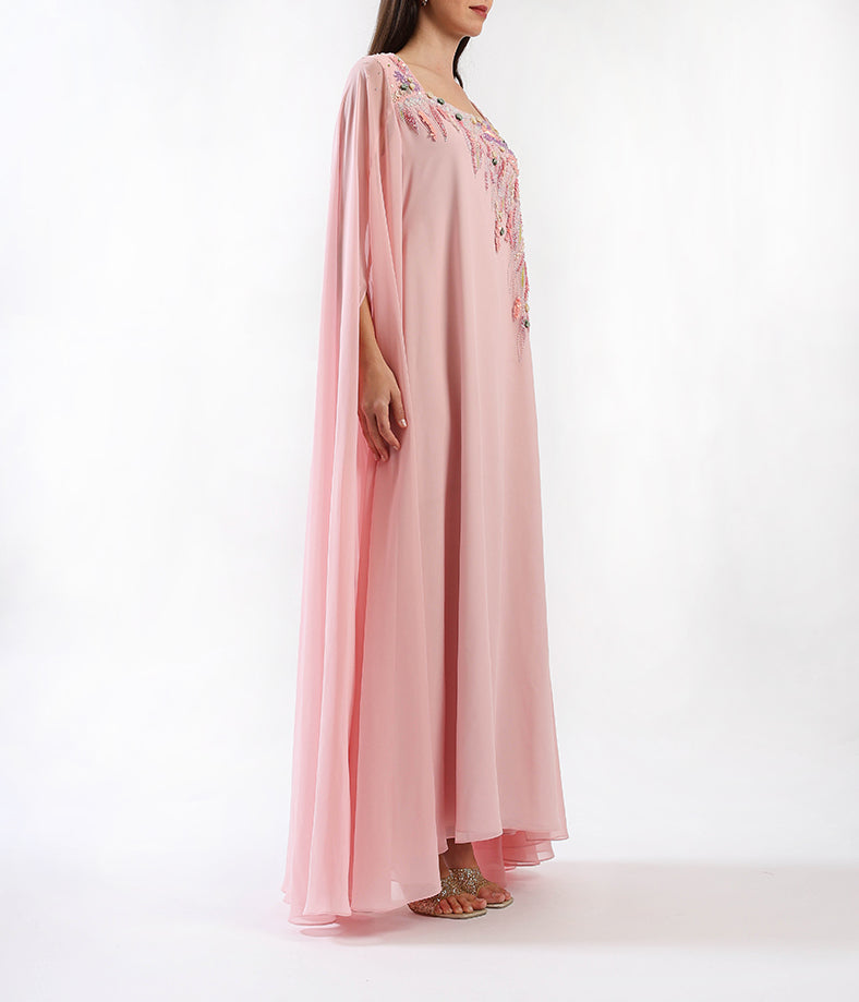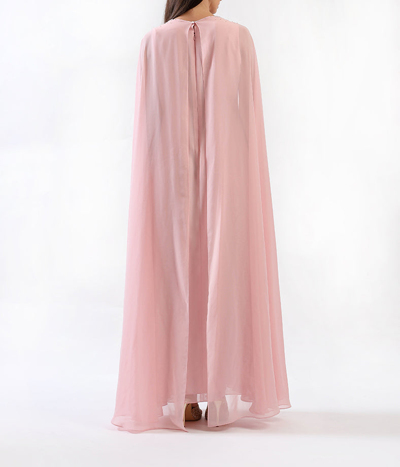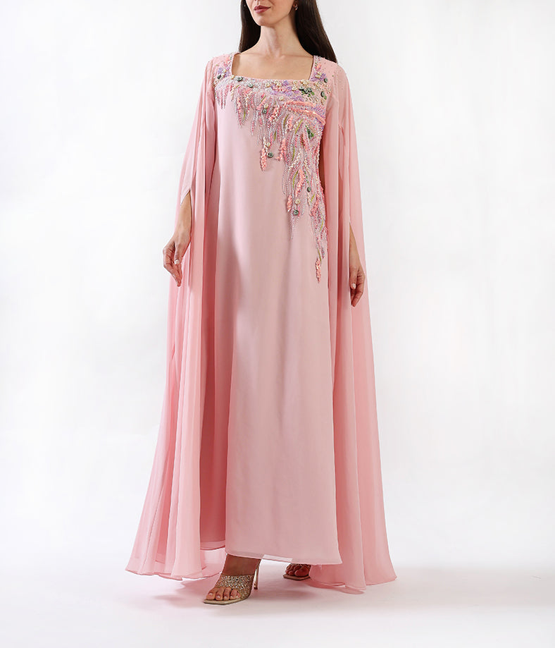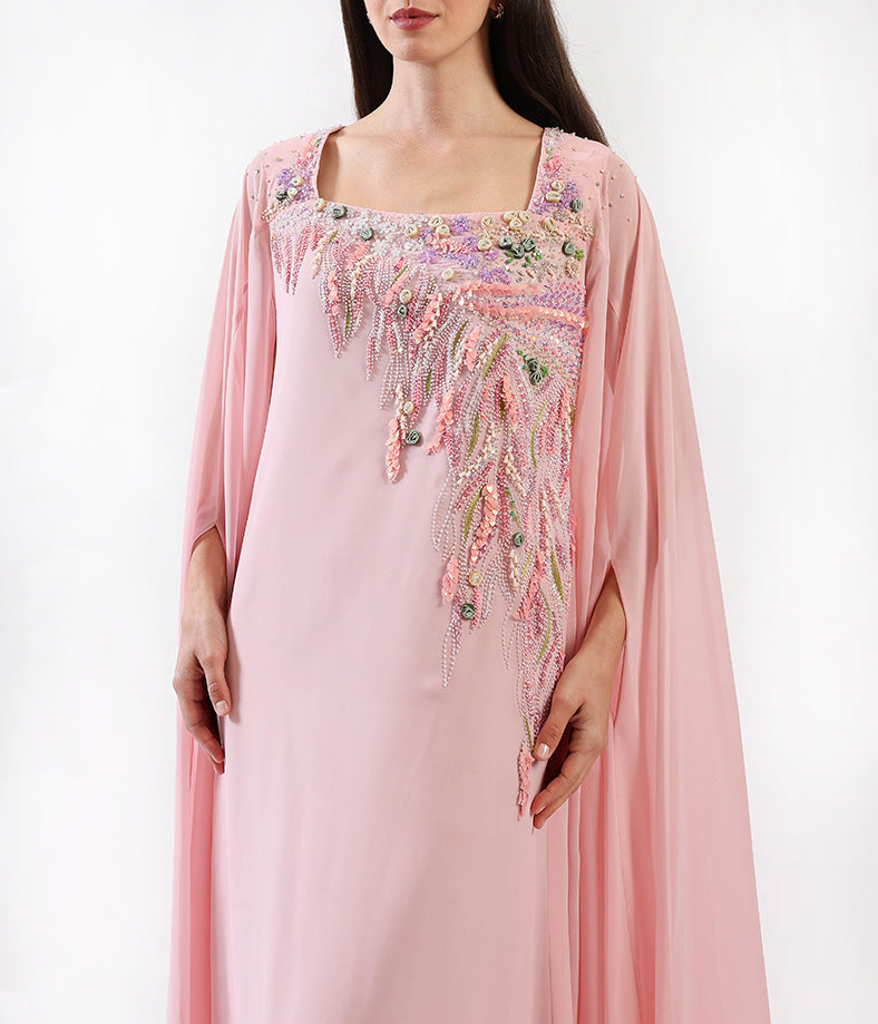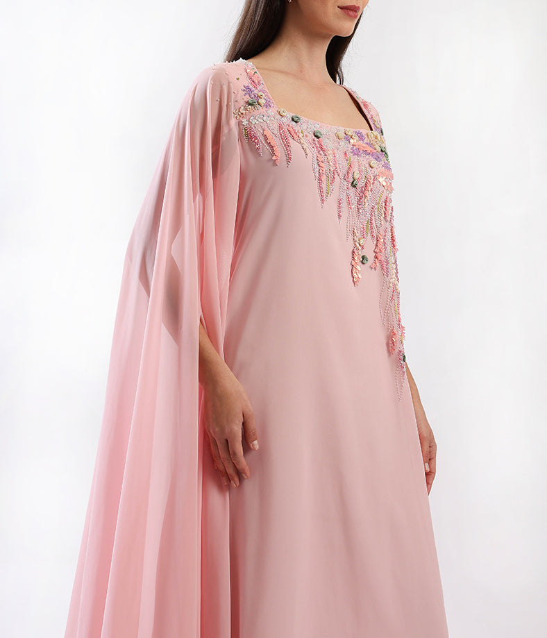 A soft blush pink dress, featuring delicate floral embroidery across the bodice and a sheer, draped cape.