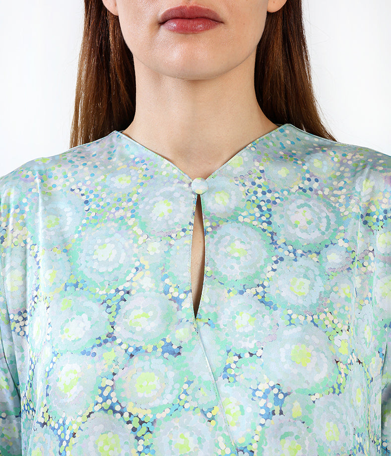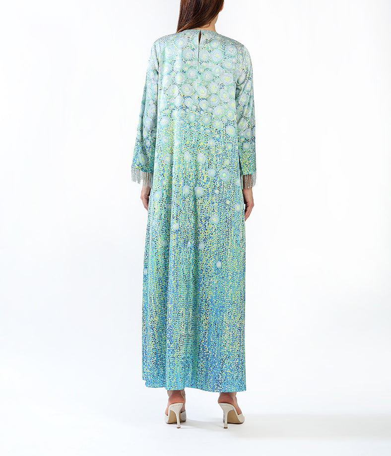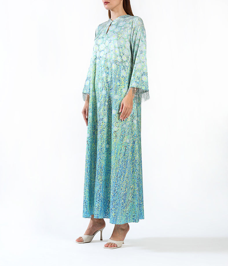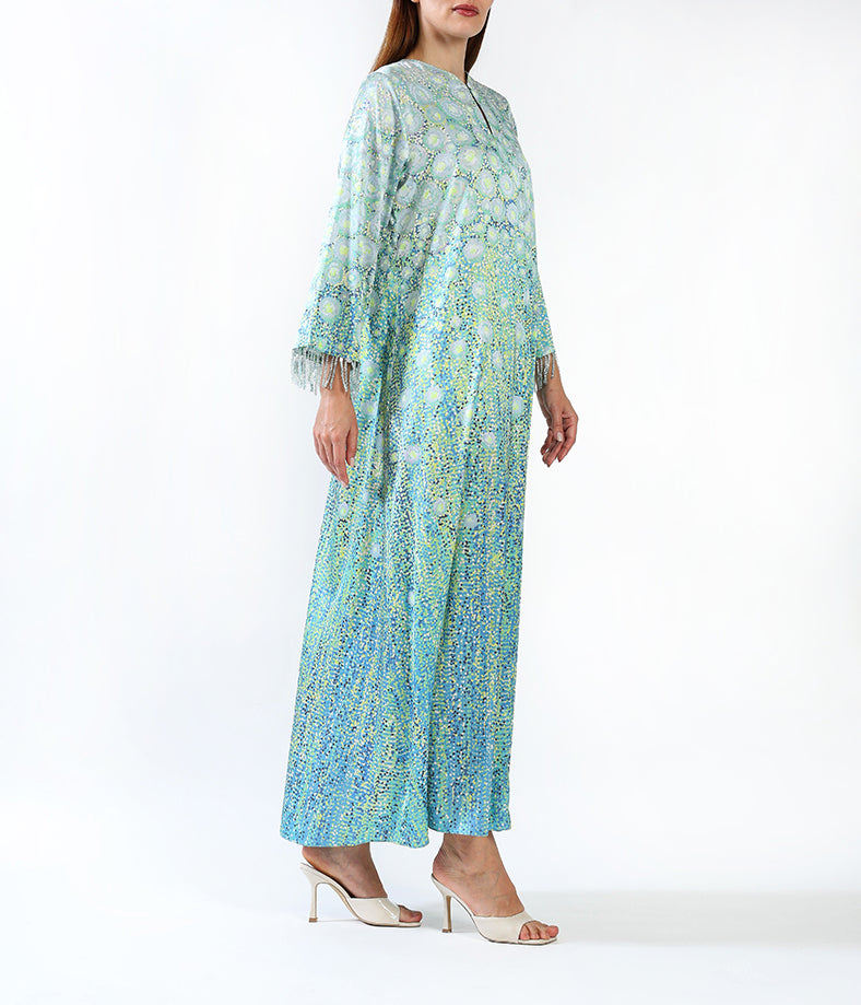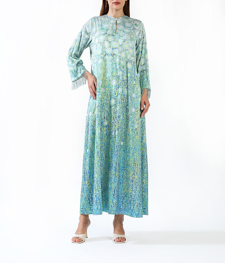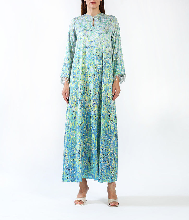 Printed kaftan features a soft flowy silhouette with an abstract circular dot pattern in shades of blue-green and hits of yellow. Designed with a modest round neckline and subtle front detail.