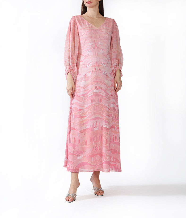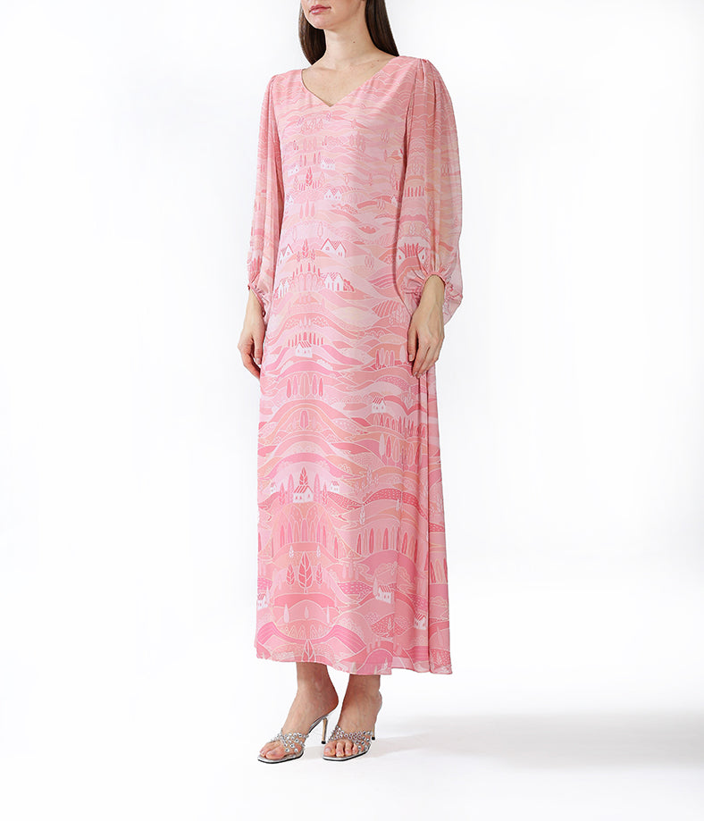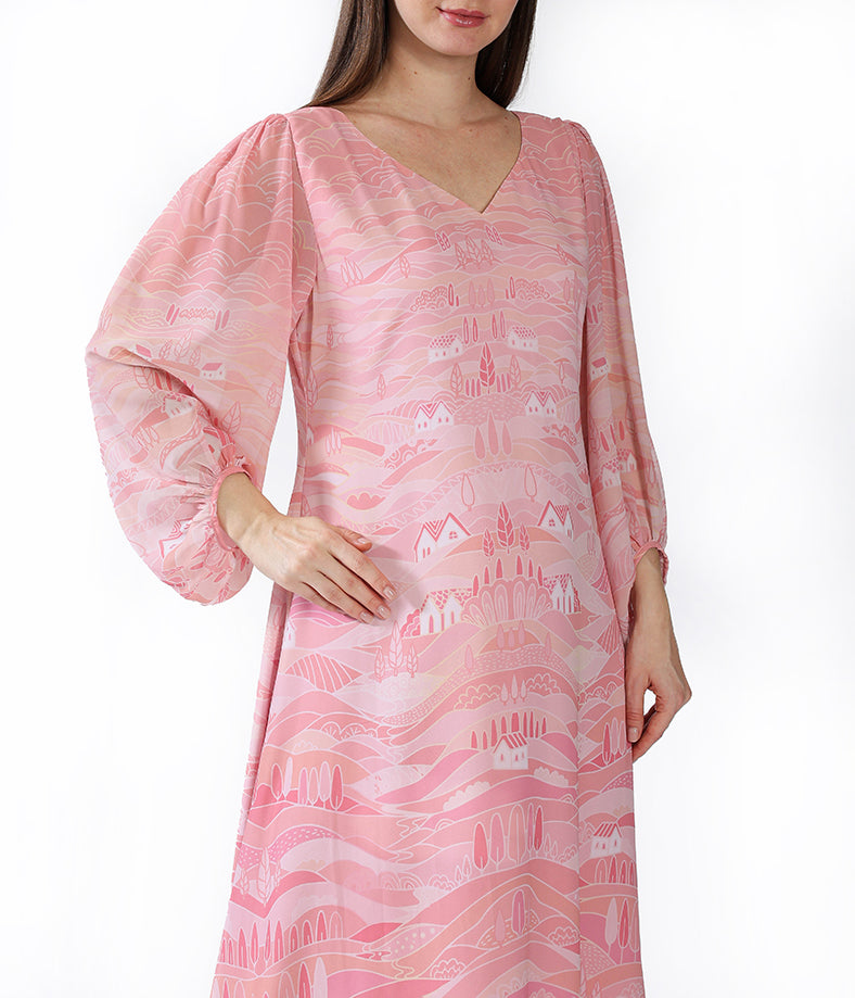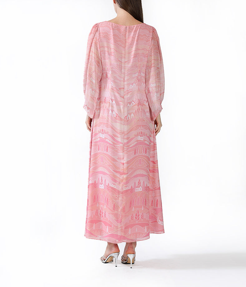 Chiffon V- neck jalabiya featuring a custom scenic landscape print,