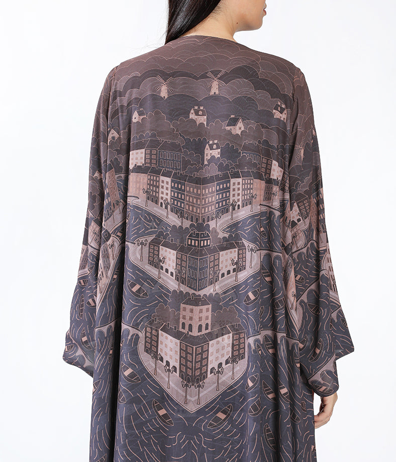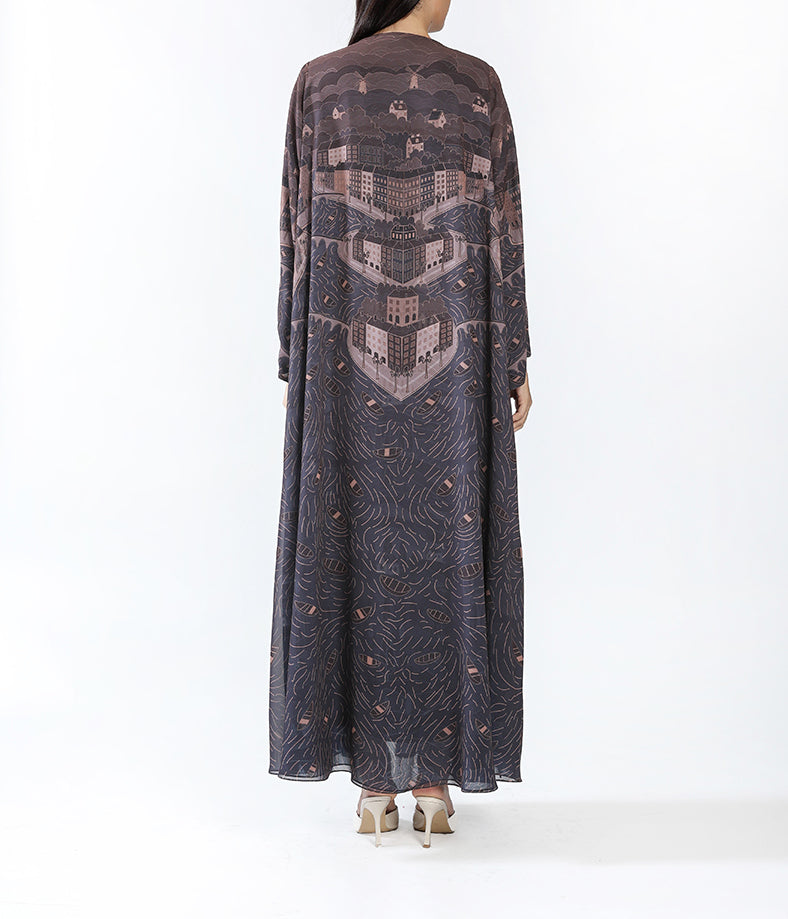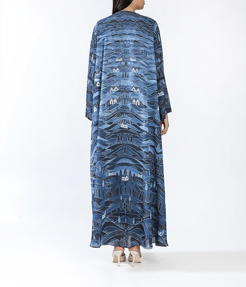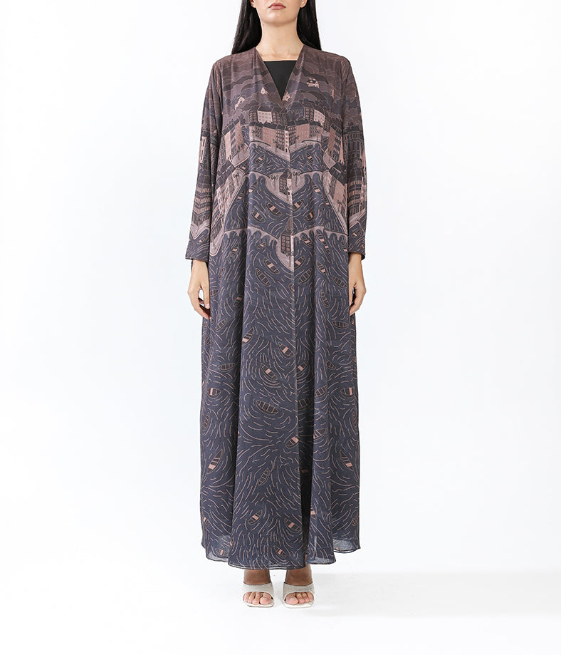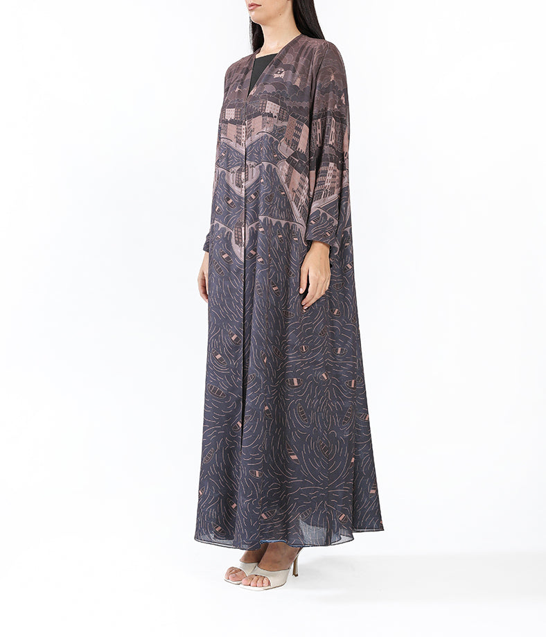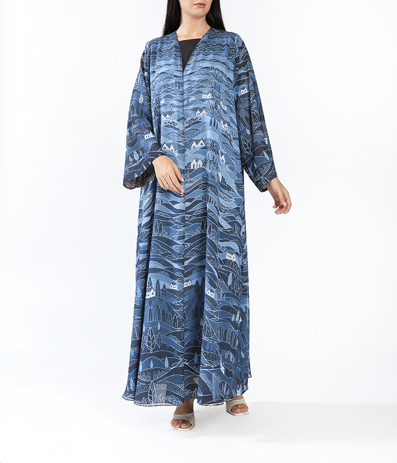 Reversible Abaya Featuring Scenic Landscape Design in Navy Blue and Light Grey. Inner Dress not included.