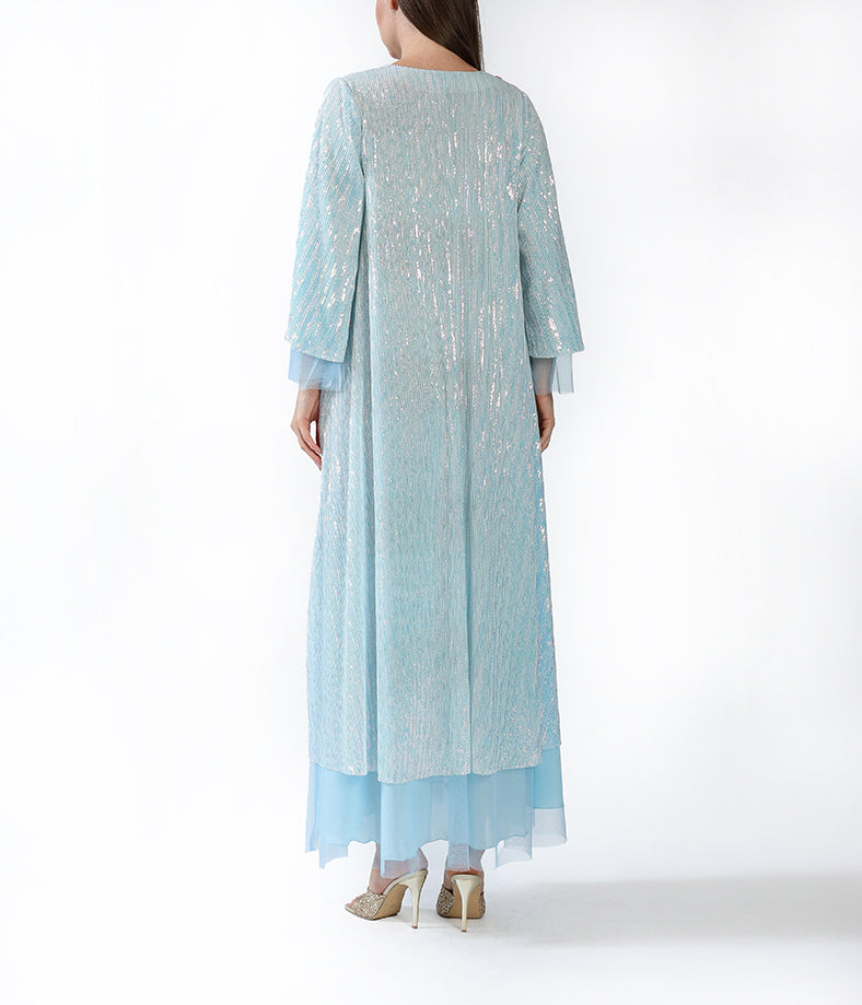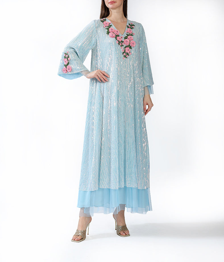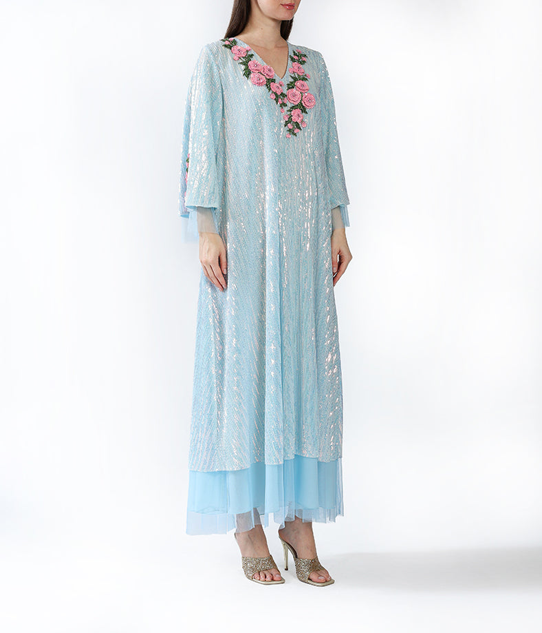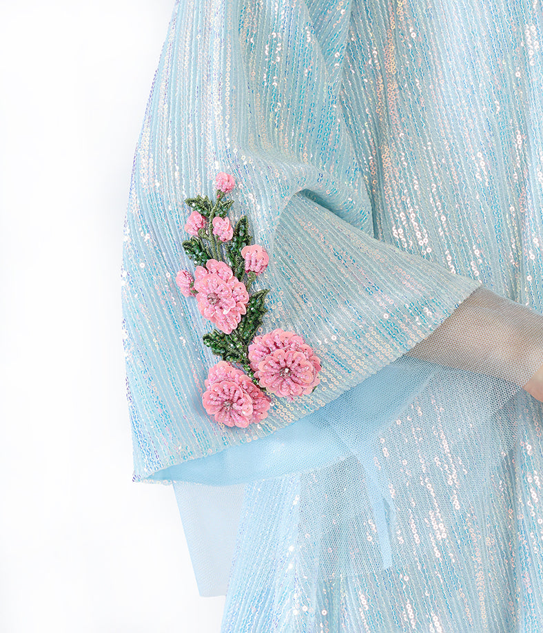 Tiffany Blue Sequin with 3d Rose Flower And Single Sleeve with Tulle Detail.