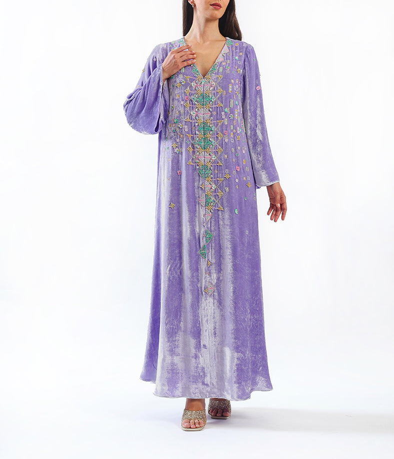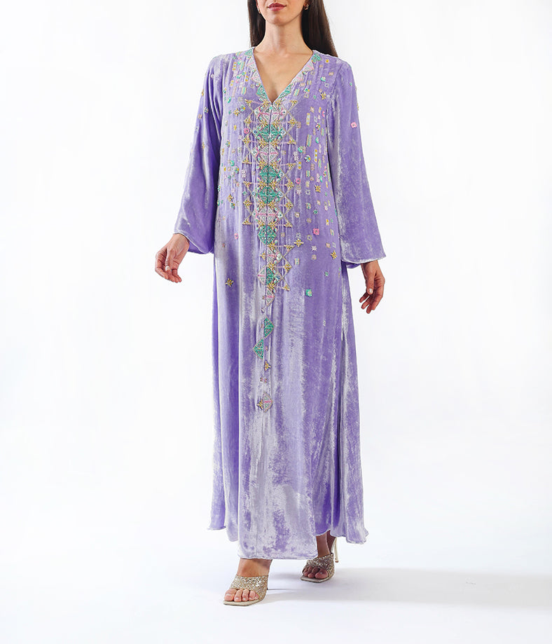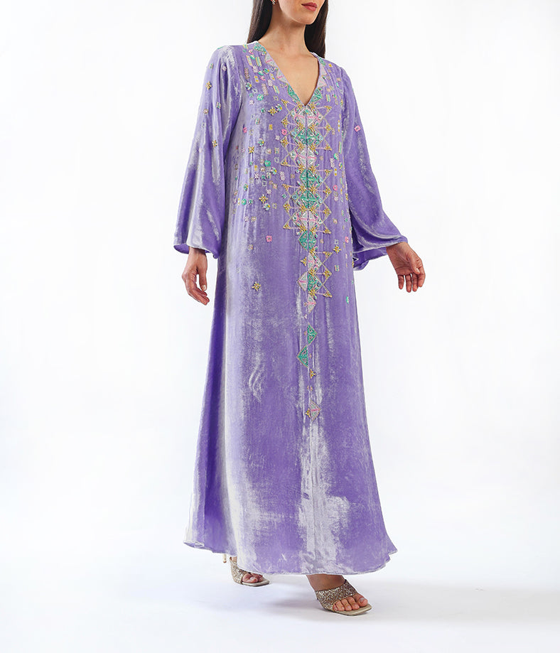 A long, elegant velvet kaftan in soft lavender shade with hand-made embellishments.