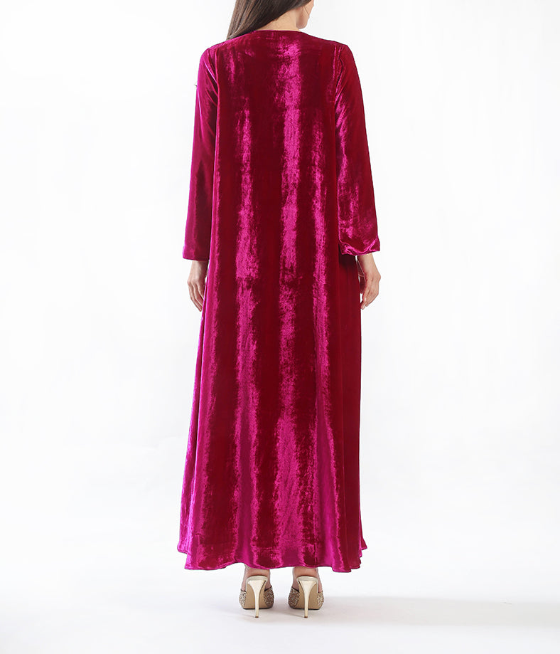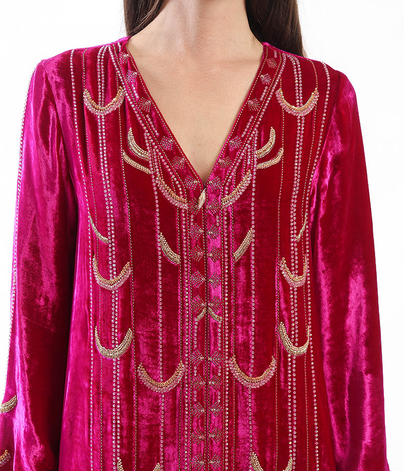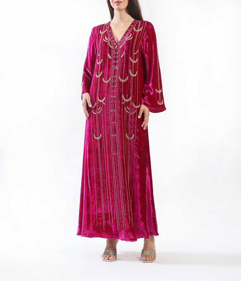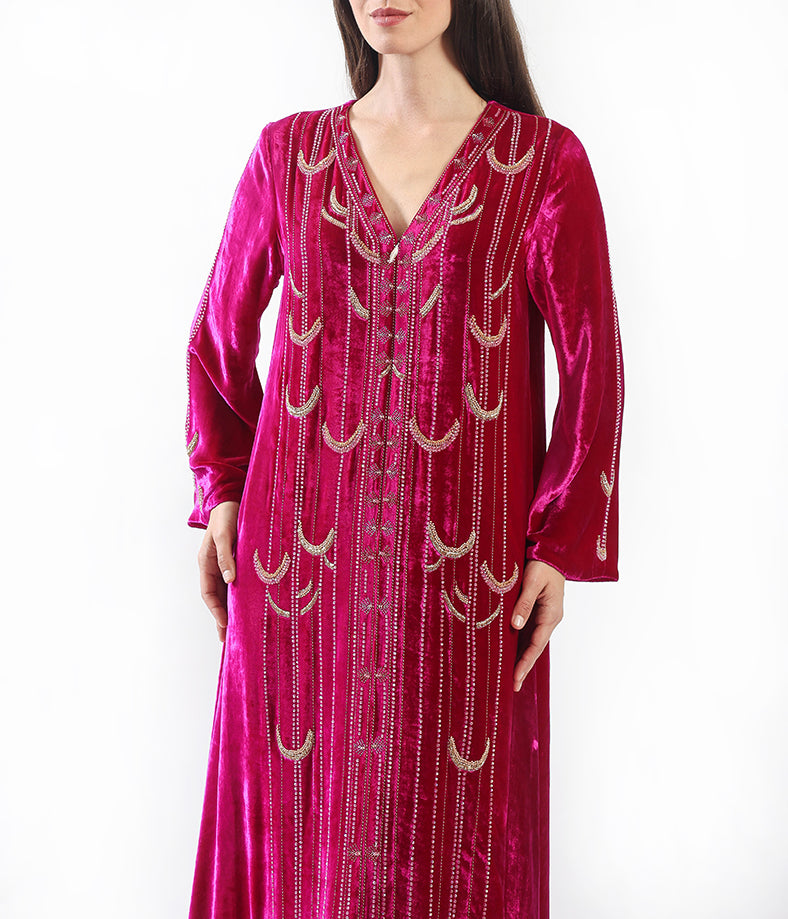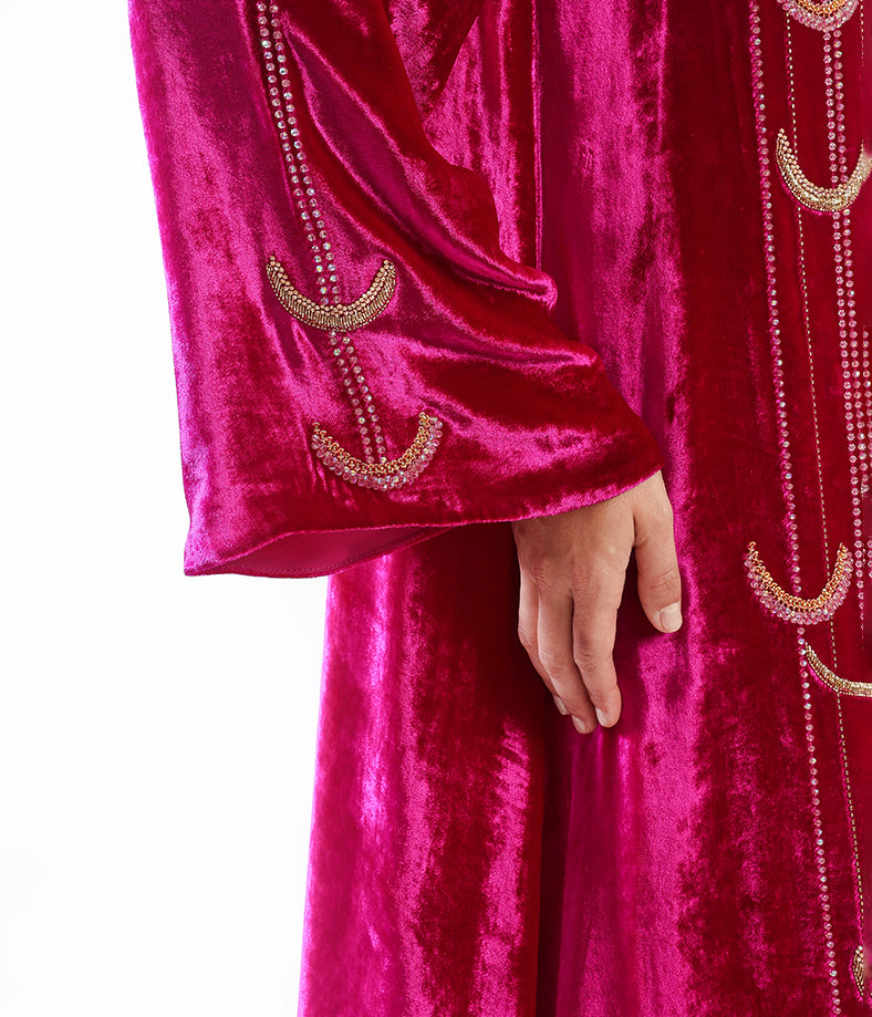 Soft velvet kaftan, featuring intricate half-moon hand embellishments.